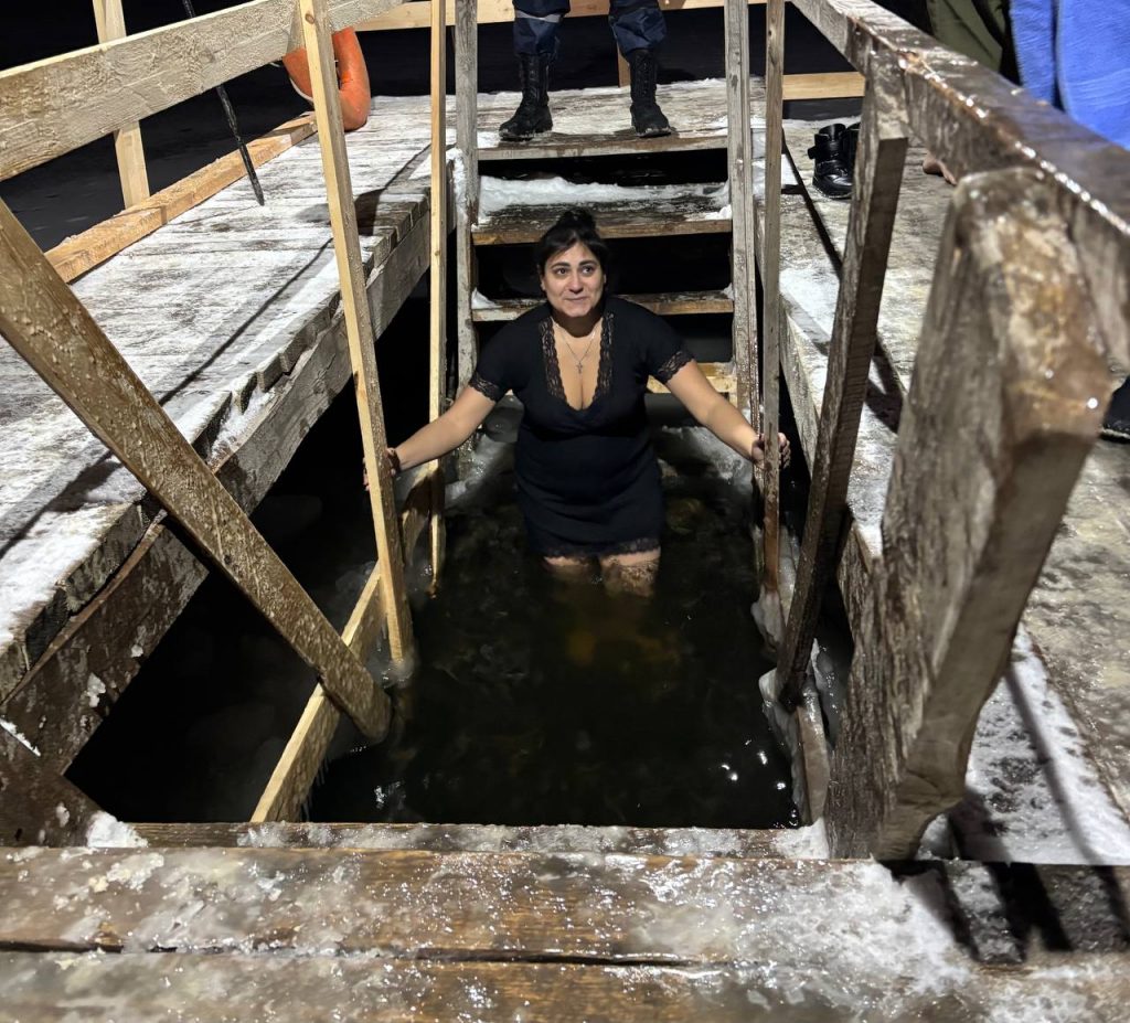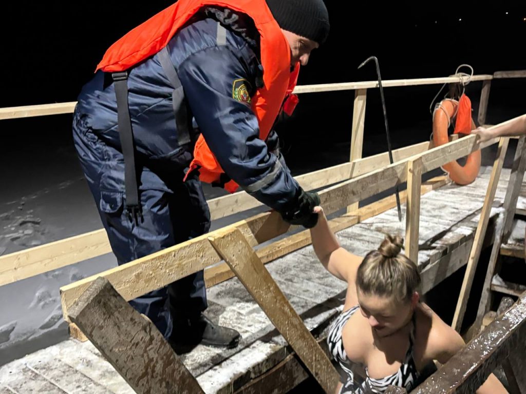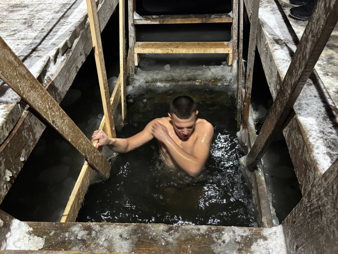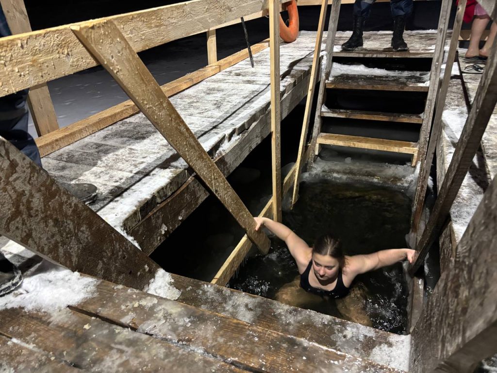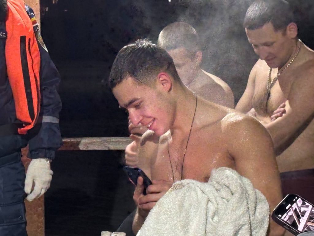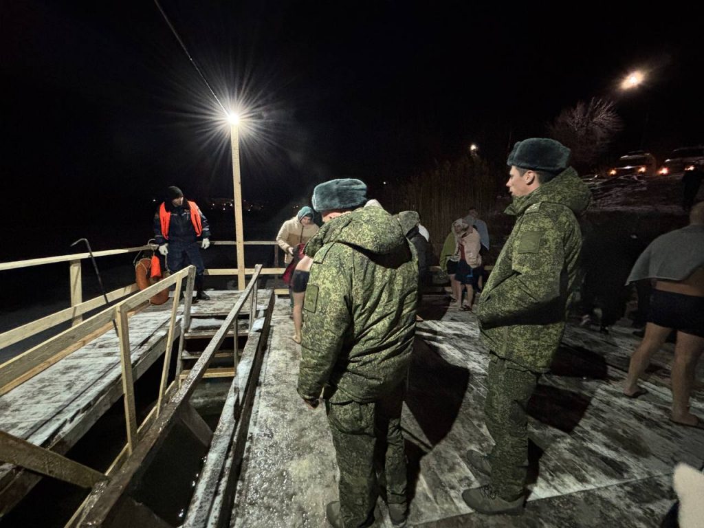 Несмотря на мороз, уже с 10 вечера к купели выстроилась очередь. Среди желающих окунуться, как мужчины, так и женщины. Участвуют в обрядовом купании и дети – малышам спасатели помогают окунуть ноги и передают в руки родителям.