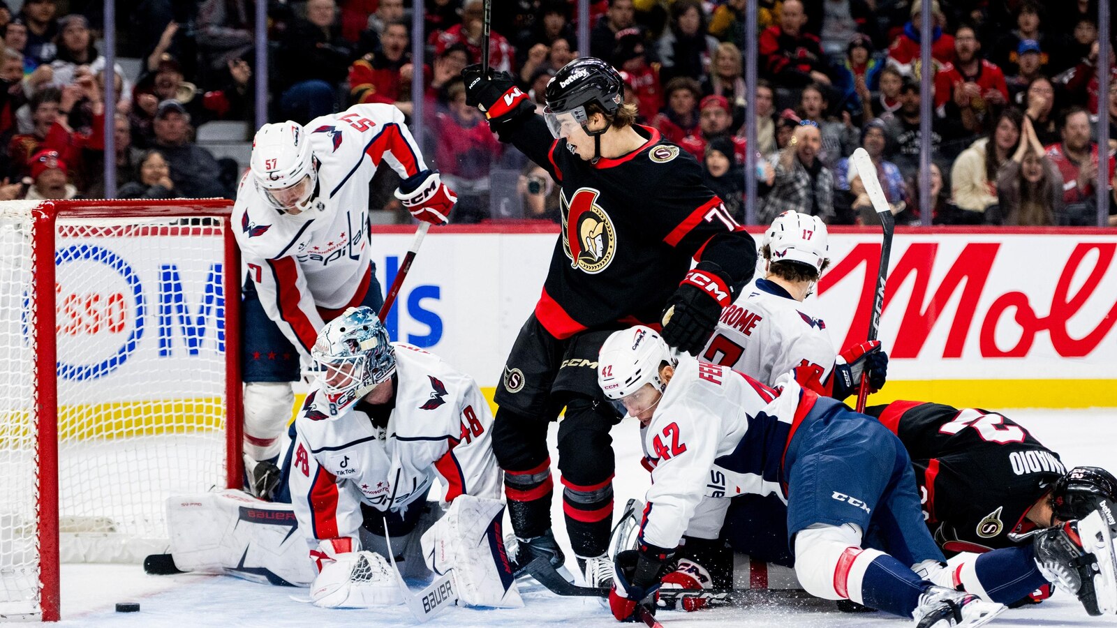 Batherson had a wide-open net late in the second period, but his shot hit the post. Greig tied it with 28.8 seconds left in the period when he deflected a shot that Thompson inadvertently pushed across the goal line.
