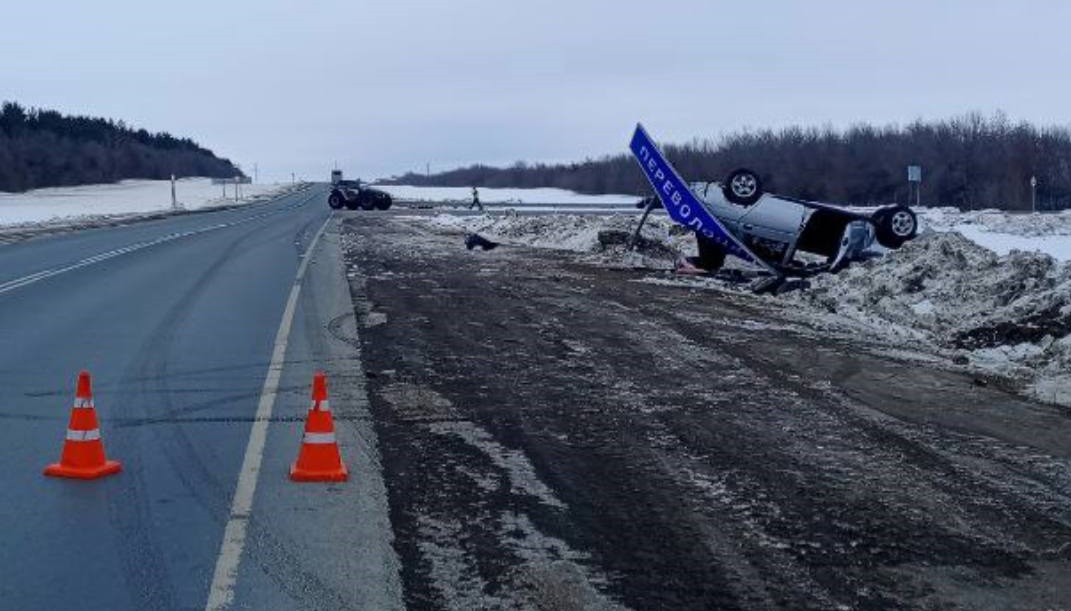 Столкнулись ВАЗ-2112 и снегоболотоход. После удара легковушка протаранила дорожный знак и опрокинулась на крышу.