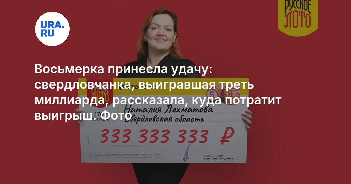 Одним из четырех лотерейных мультимиллионеров «Новогоднего миллиарда» от «Русского лото», выигравшим 333 333 333 рубля, стала молодая мама, педагог-психолог из небольшого свердловского поселка Наталия Лохматова. Девушка выбрала счастливое для их семьи число — восемь, которое и оказалось в игровых полях. Выигрыш она планирует потратить на благотворительность, помощь маме, сыну, родственникам, покупку квартиры и машины.