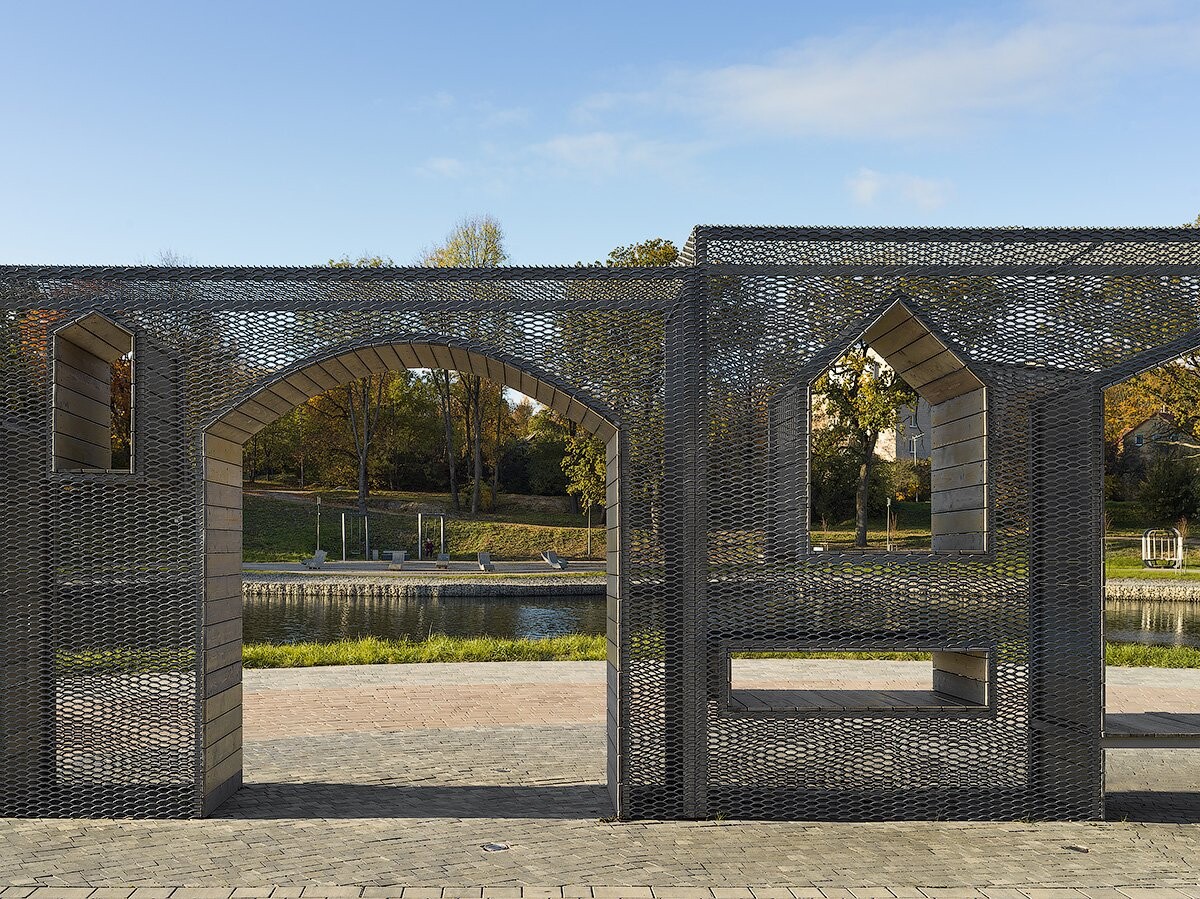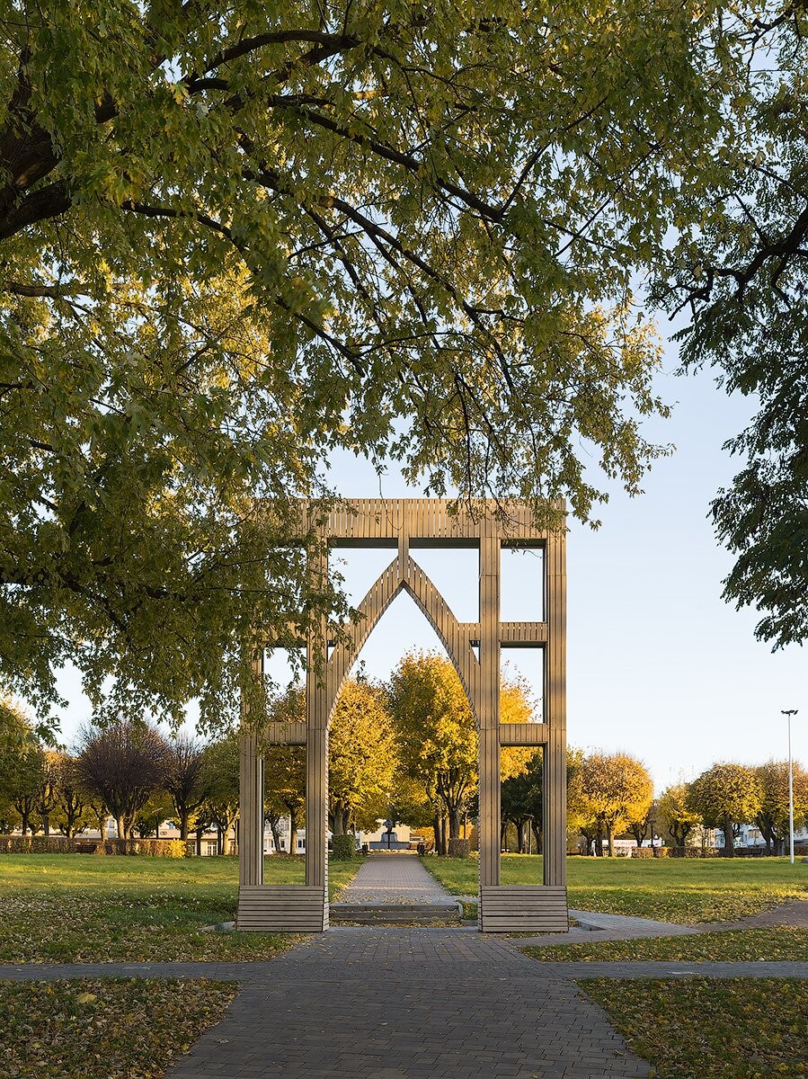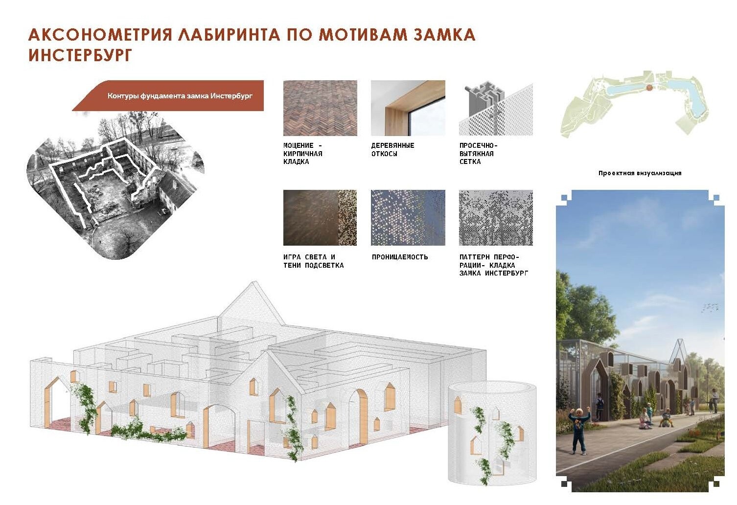 Проект благоустройства, выполненный в рамках конкурса на создание комфортной среды в малых городах и исторических поселениях, призван не просто обновить общественное пространство, добавляя и переосмысляя функции, но создать место, отражающее уникальность Черняховска. Основой дизайн-кода стал новый визуальный язык, который состоит из соединения трех принципов: существующих исторических форм, ощущенческих характеристик города и новых привносимых приемов, которые позволяют визуально объединить контекст. Таким образом, новые истории и образы Черняховска возникают из различных комбинаций этих трех принципов. Например, формулой арт-объекта «Лабиринт» стало соединение форм замка Инстербург, прозрачности и белой металлической сетки.