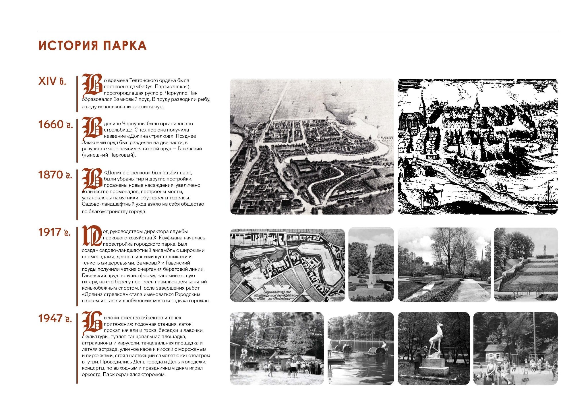 У парка богатая история. Во-первых, он создавался вокруг рыцарского замка Инстербург. Тогда же, во времена Тевтонского ордена, в XIV веке, была построена дамба, перегородившая русло ручья Чернуппе — так образовался Замковый пруд. В пруду разводили рыбу, а воду использовали как питьевую.