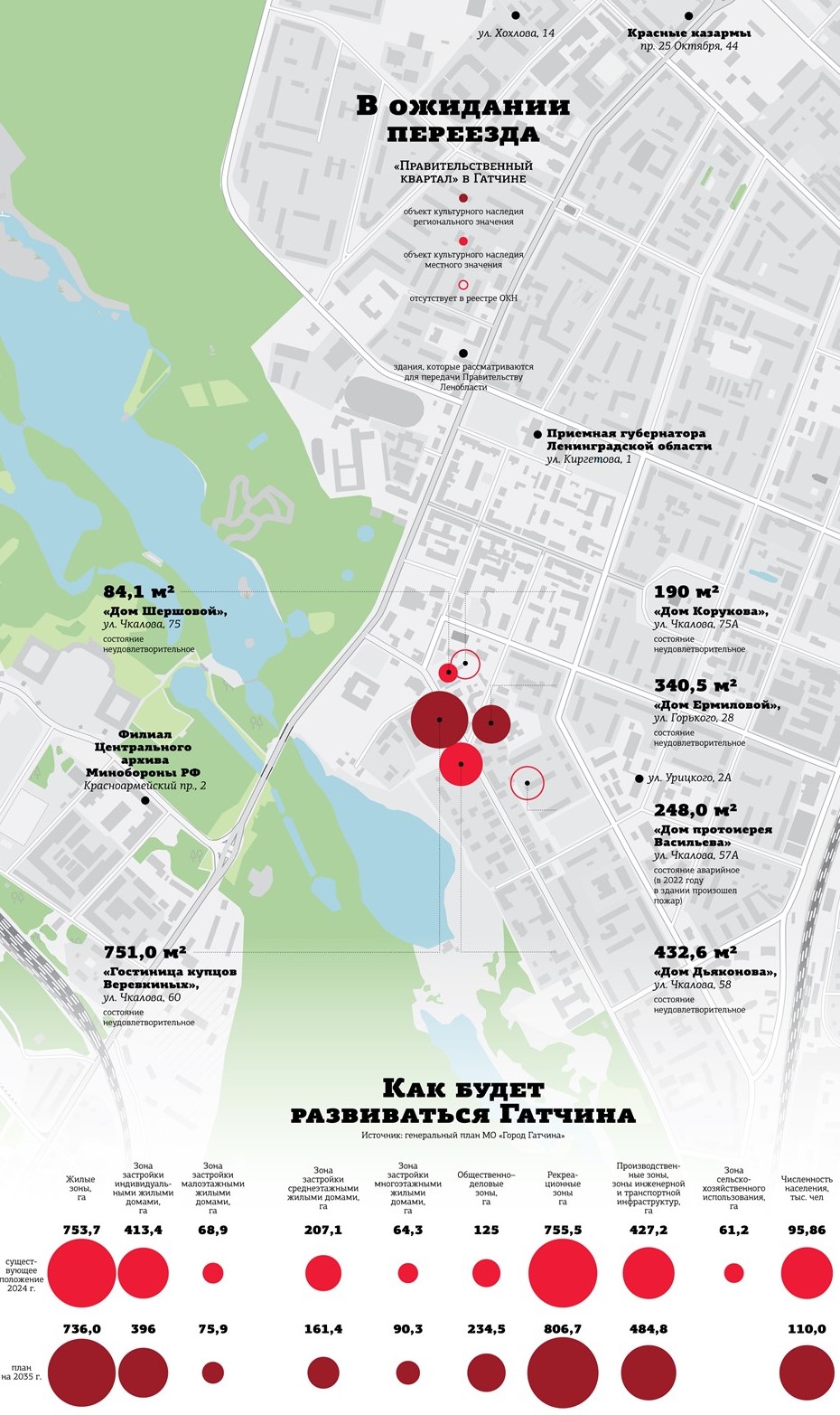 Основной площадкой для будущих офисов чиновников станет так называемый правительственный кварталв районе улиц Чкалова, Горького, Карла Маркса в историческом центре Гатчины. Изначально в перечень адресов вошли 11 деревянных построек, позже их количество сократилось до семи. В 2024–м дома передали на баланс региону. На прошлой неделе глава администрации Гатчинского района Людмила Нещадим сообщила, что один из них, "Ансамбль госпитального городка", убрали из списка: его отдадут под НКО.