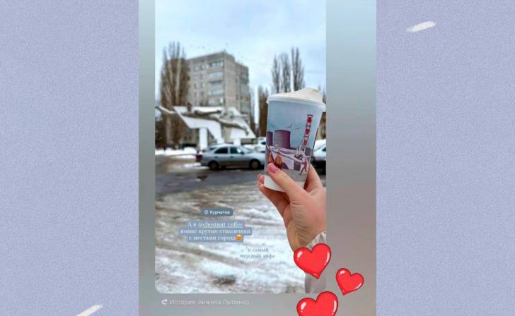 Лиза изобразила на стаканчиках места, которые известны каждому курчатовцу - памятник «Мирный атом», здание Курской АЭС и набережную «Тёплый берег». Ей хотелось, чтобы люди пили кофе, и заодно разглядывали рисунки - вспоминали знакомые места.
