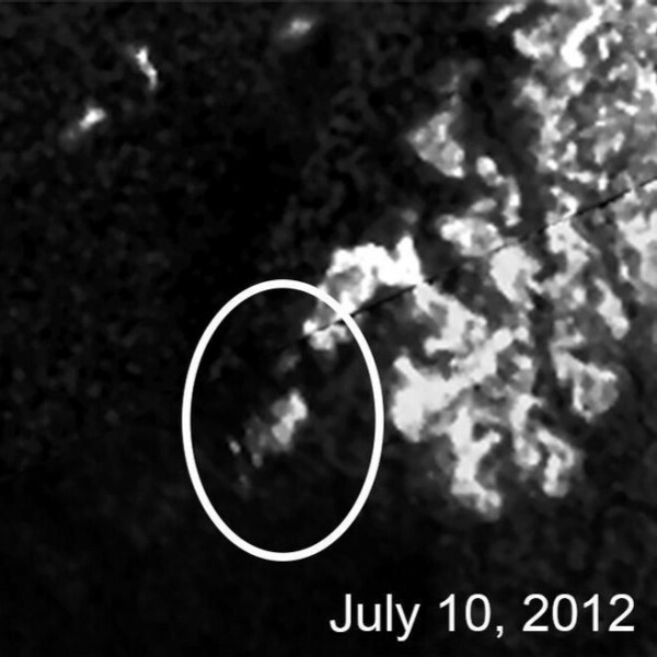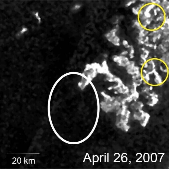 NASA связало аномалию с формированием и разрушением необычных айсбергов. Море Лигеи состоит из жидких углеводородов - преимущественно метана. Температура на поверхности Титана около -179 градусов Цельсия, что позволяет метану и этану существовать в жидком виде. Но при сезонном охлаждении или изменении давления эти органические соединения замерзают, формируя плавающие глыбы - аналоги земных айсбергов. Процесс может начинаться вокруг центров кристаллизации - твердых частиц, попавших в жидкость: пылинок из атмосферы или обломков породы с берега. Вокруг таких "зародышей" нарастает лед, образуя массивные структуры. Но стоит температуре повыситься, и это природное образование начинает разрушаться, что мы видим на третьем изображении (яркая вершина исчезла, а массивное основание "пришвартовалось" к берегу).