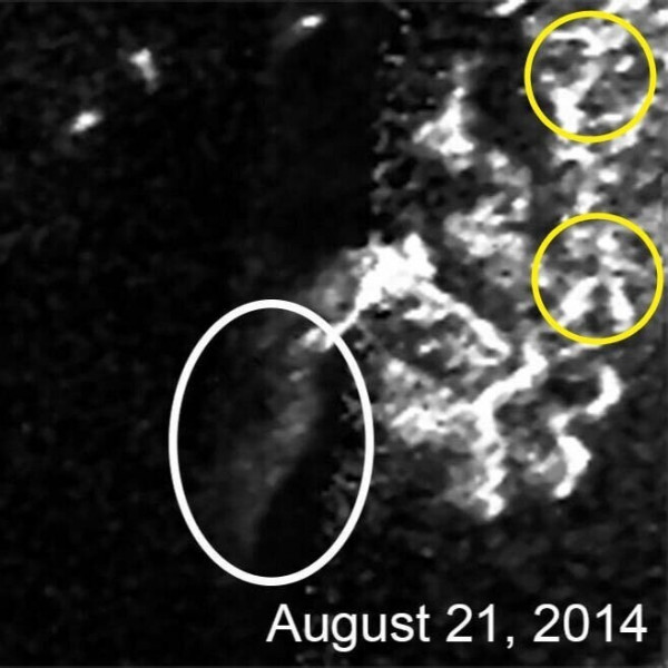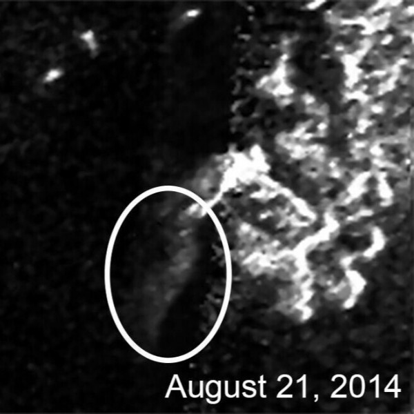 Первый снимок, сделанный в апреле 2007 года, - контрольный. Ничего необычного. Но на втором (июль 2012) внезапно появляется яркое пятно - словно кусок суши обнажился из-под жидкости. К августу 2014 года его внешний вид изменился: объект стал намного тусклее, но при этом вдвое больше, увеличившись с 75 до 160 квадратных километров.