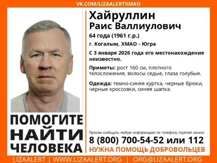 «Пропал Хайруллин Раис Валиуллович, 1961 года рождения. С 3 января 2026 года его местонахождение неизвестно», — сообщил в соцсетях поисковый отряд «ЛизаАлерт».