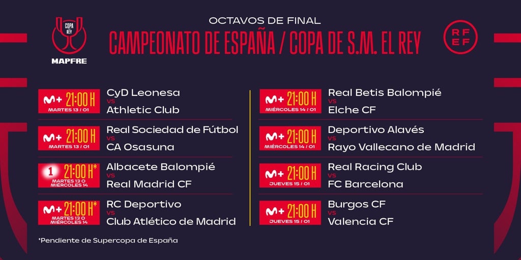 Así, los cruces decidieron que el Real Madrid viajara a Albacete, y el Barcelona, a Santander; el Atlético tendrá de rival al Deportivo, y el Athletic, a la Cultural Leonesa. Además: Burgos - Valencia, Betis - Elche, Real Sociedad - Osasuna, y Alavés - Rayo, que fue el último equipo en lograr la plaza para estos octavos de final.