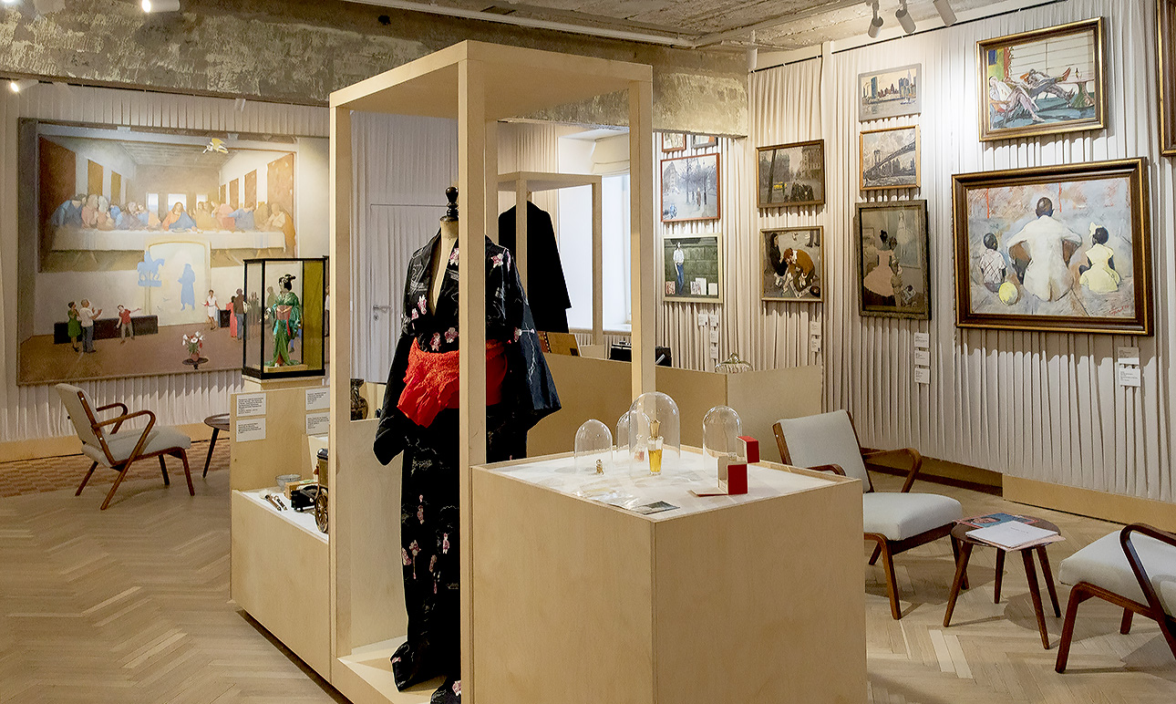 Чтобы подчеркнуть все эти факторы, выставочный архитектор Игорь Чиркин (бюро Project Eleven) создал необычную застройку. Помимо пространства для развески картин, в залах возникла зона, изображающая иностранный люксовый парфюмерный магазинчик (с пробниками), парижское кафе с аутентичными стульями и так далее. В этих локациях размещены артефакты: кимоно гейши, которое Николай Ромадин привез из Токио в 1970-е, французские платья, лаковые сумочки Hermès — чего только не нашлось на антресолях мастерских!.