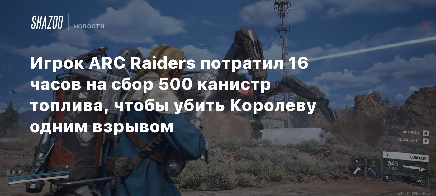 Обычное оружие для такого подвига, естественно, не годится – будь это возможно, у Embark были бы серьёзные проблемы с балансом. Но Зиб нашёл обходной путь: самодельная бомба из сотен синтезированных топливных канистр. Урон от взрывов суммируется для каждой поражённой части Арка, а здоровье Королевы, по оценкам игроков, составляет от 25 000 до 35 000 единиц. Теоретически около 500 канистр могло бы хватить.