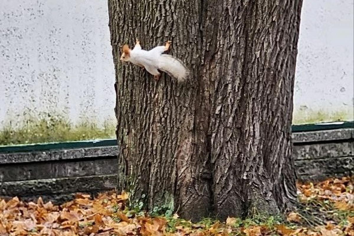 В одном из парков Петербурга заметили белку с необычным окрасом. Маленький зверек был почти полностью белым.