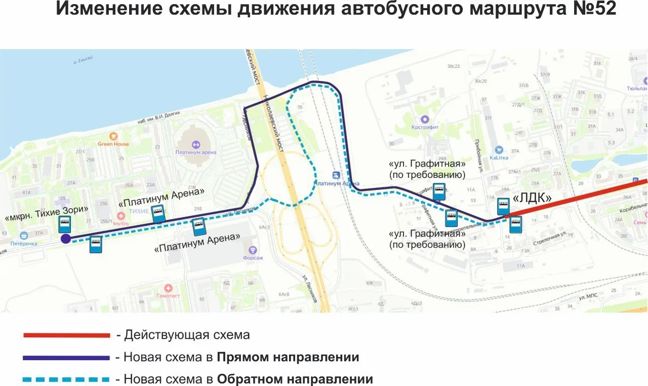 В схему добавятся три остановки – «Микрорайон «Тихие зори», «Платинум Арена» и новая остановка «Графитная», на которой посадка-высадка пассажиров будет осуществляться по требованию.