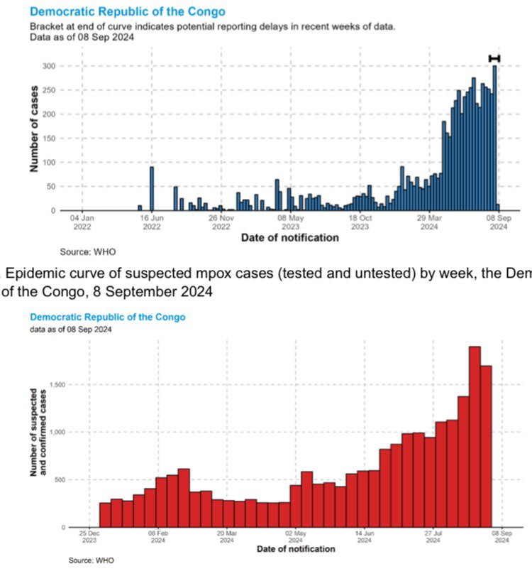 А вот так вот выглядит летний подъем случаев обезьяньей оспы в ДРК. Вверху - подтвержденные случаи, внизу - подозрительные. Вторых, разумеется, намного больше. Большинство из них - это реальные случаи, у контактных. Просто ПЦР анализ никто не делал. За последние три недели вирус оспы устойчиво перелез в Бурунди, и там теперь тоже очаг.