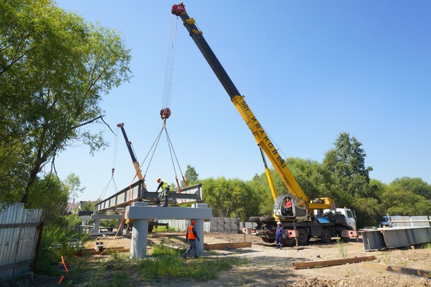 В Иркутске началось возведение моста через реку Ушаковку. Монтаж производится в рамках строительства теплового луча, которое реализуется энергохолдингом Эн+. С помощью двух кранов энергетики установили первый пролет весом 23 тонны и длиной 33 метра. Оставшиеся конструкции по 18 тонн каждая смонтируют в ближайшее время.