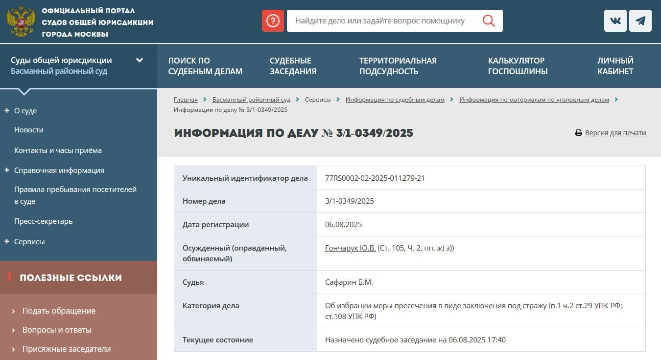В картотеке дел суда уточняется, что Горчаруку вменяется убийство, совершённое группой лиц по предварительному сговору, из корыстных побуждений (п. «ж», «з» ч. 2 ст. 105 УК РФ). За данное преступление предусмотрено наказание в виде лишения свободы сроком от 8 до 20 лет. Следствие настаивает на заключении под стражу, сообщает ТАСС.