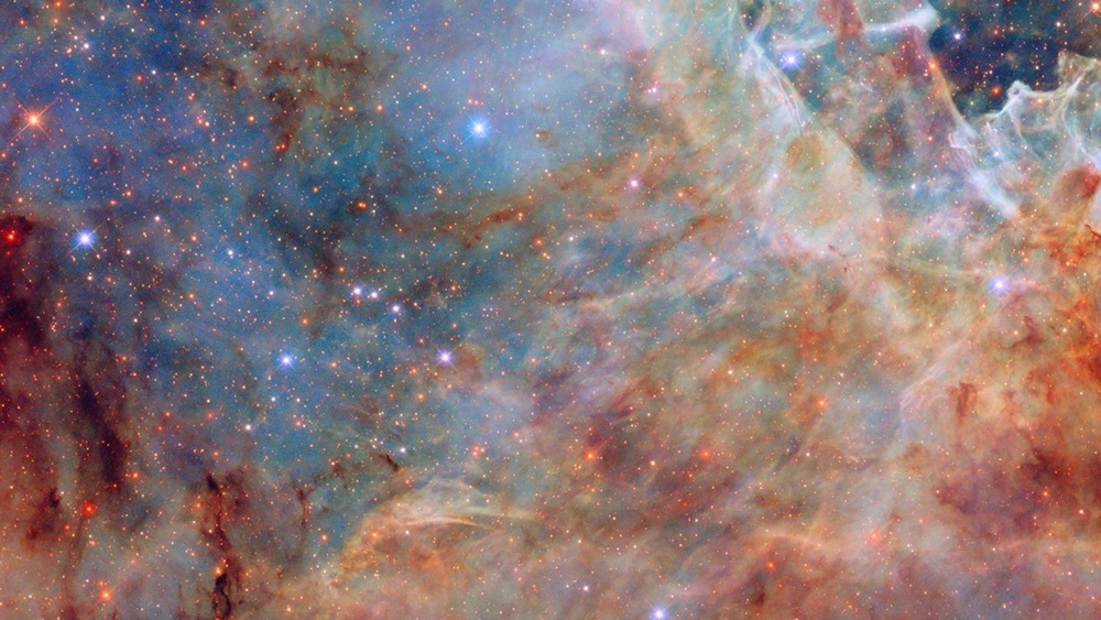 На показанном участке туманности виден спокойный синий газ, коричнево-оранжевые пылевые пятна и россыпь разноцветных звезд. Звезды внутри и за пылевыми облаками выглядят более красными, чем те, которые не скрыты пылью. Пыль поглощает и рассеивает синий свет больше, чем красный, что позволяет большему количеству красного света достигать наших телескопов.