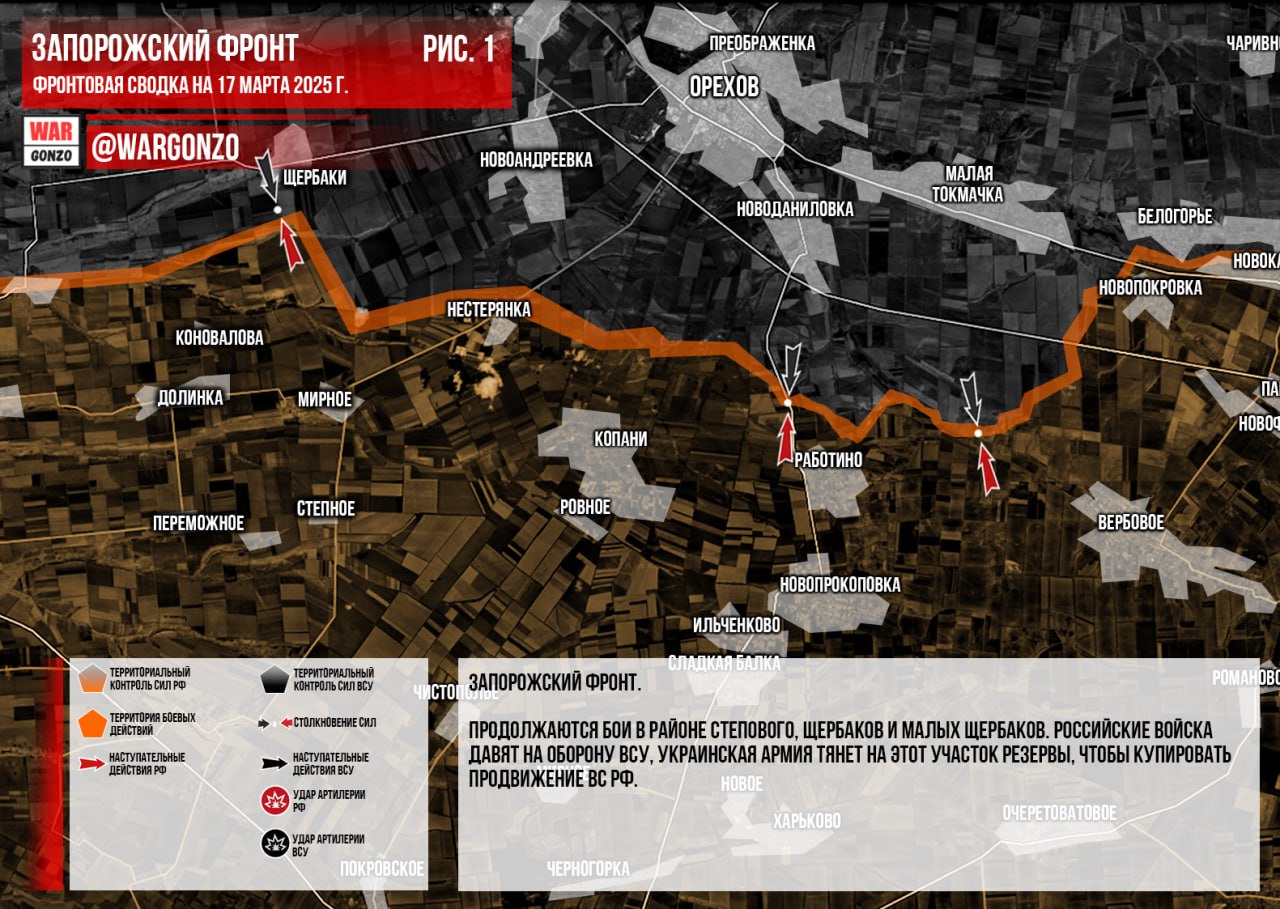Запорожский фронт. Продолжаются бои в районе Степового, Щербаков и Малых Щербаков. Российские войска давят на оборону ВСУ, украинская армия тянет на этот участок резервы, чтобы купировать продвижение ВС РФ. (Рис.1)