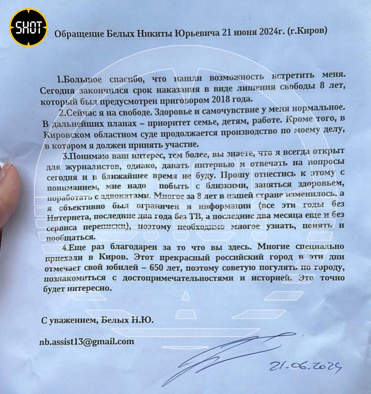 Экс-губернатор перед выходом из колонии написал письмо общественности. Никита Белых рассказал, что в ближайшее время планирует прогуляться по Кирову, увидеться с семьей, побыть с детьми, и попросил пока его не тревожить.