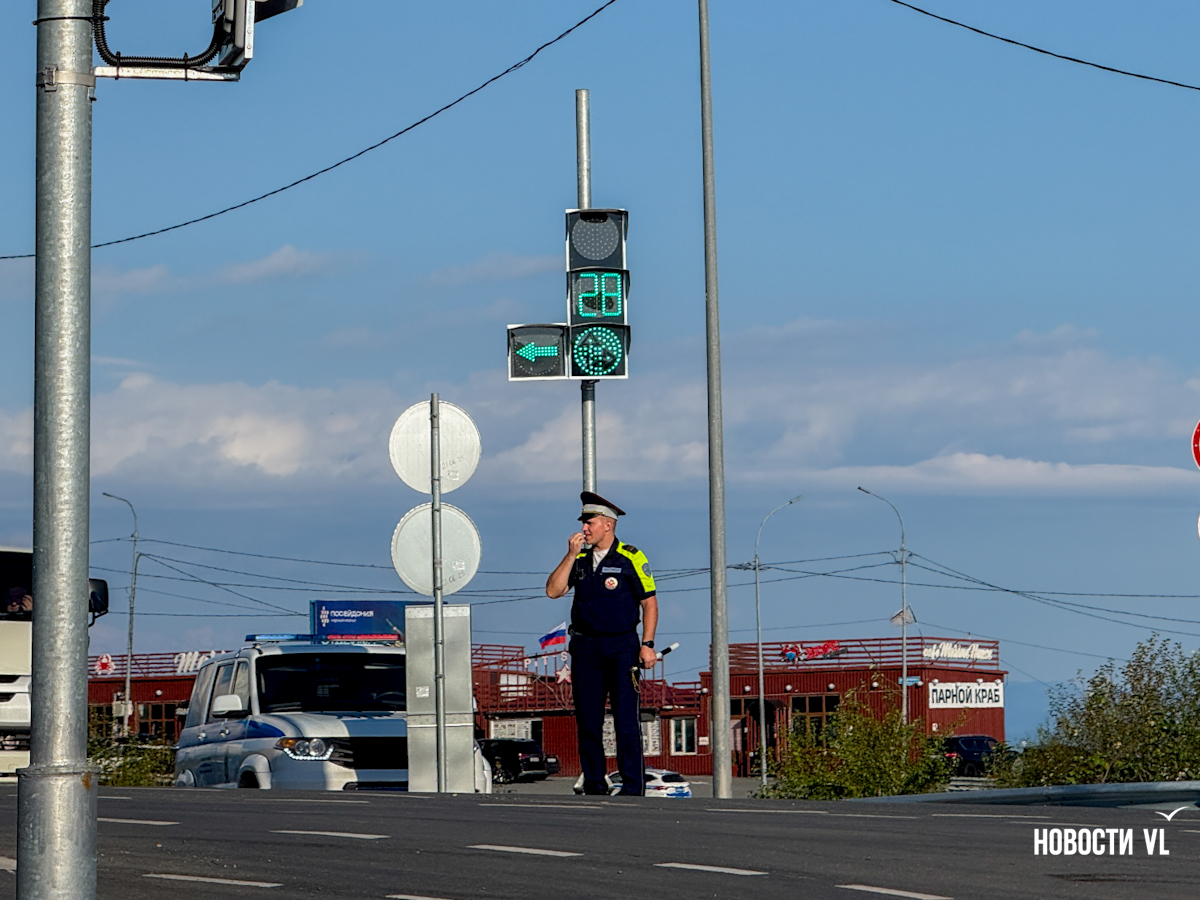 Перед Восточным экономическим форумом здесь появился наряд ДПС. Инспекторы дежурят каждый день. Их задача – не регулировать потоки и не штрафовать тех, кто не понял, как правильно проехать перекрёсток, а при необходимости перекрыть дорогу, чтобы пропустить кортеж. Но они всё-таки время от времени помогают водителям – могут поднять жезл и руками показать, кому стоит ускориться, а кому повернуть. Так, например, было, когда грузовик Mitsubishi ехал со стороны Тихой и начал поворачивать налево, хотя можно было ехать только прямо или направо.