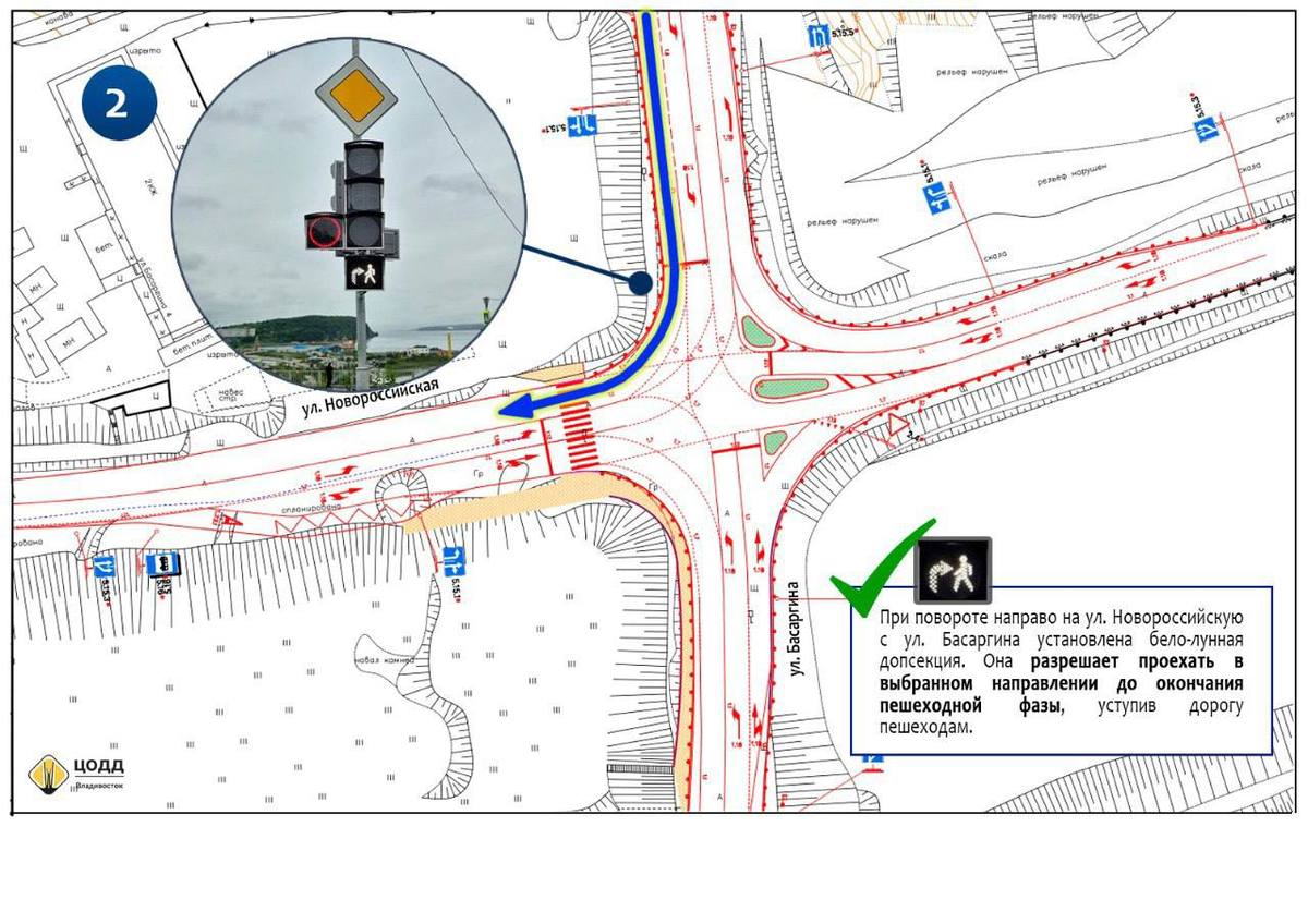 Со стороны трассы Седанка – Патрокл тоже есть полоса для поворота в сторону Тихой, но нет дополнительной секции светофора. Когда включается красный – а горит он здесь около 2 минут – некоторые водители, которым нужно направо наверх, тоже останавливаются. Но эта полоса светофору не подчиняется, ехать можно, уступая тем, кто поднимается слева, со стороны бухты Соболь. Тем же, кто поворачивает налево или едет прямо прямо с сторону Сочинской, даётся всего 15 секунд зелёного.