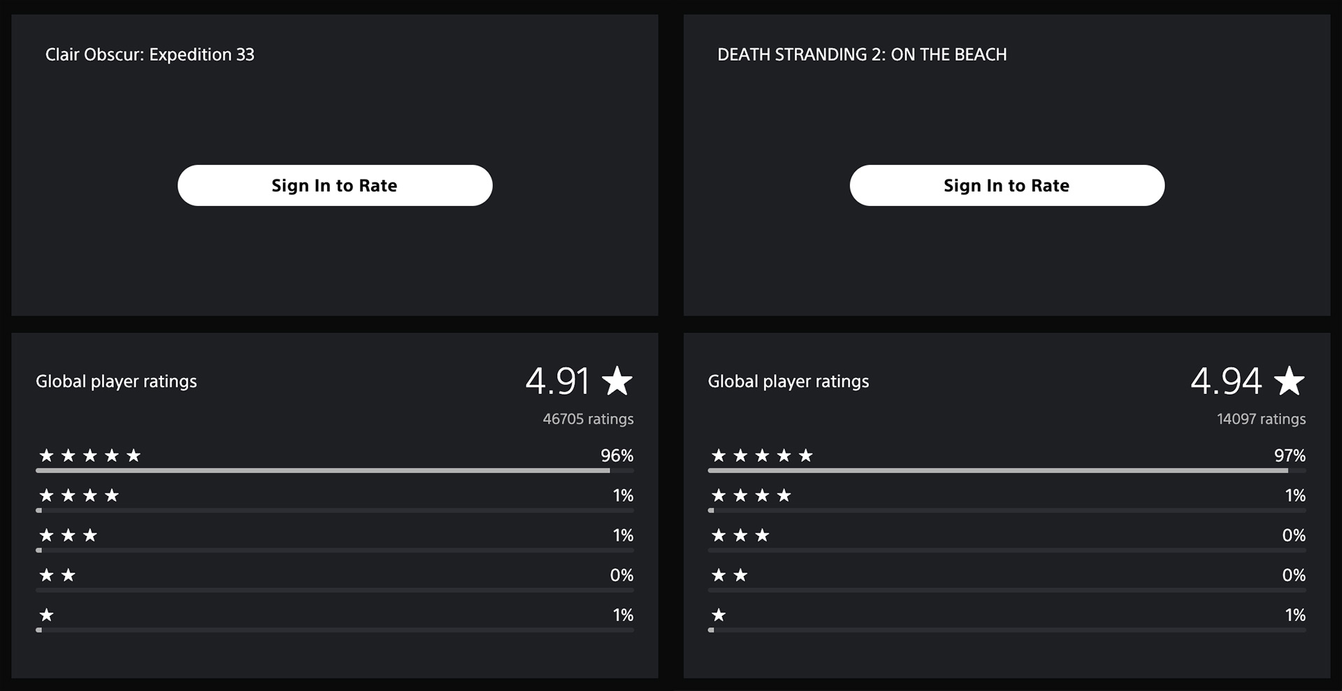 На момент написания статьи Death Stranding 2: On the Beach имеет пользовательский рейтинг 4.94 на основе более 14 тысяч отзывов, что делает ее игрой с самым высоким рейтингом в PlayStation Store. С другой стороны, Clair Obscur имеет рейтинг 4.91 при 46700+ обзорах, опустившись чуть ниже последней работы Кодзимы.