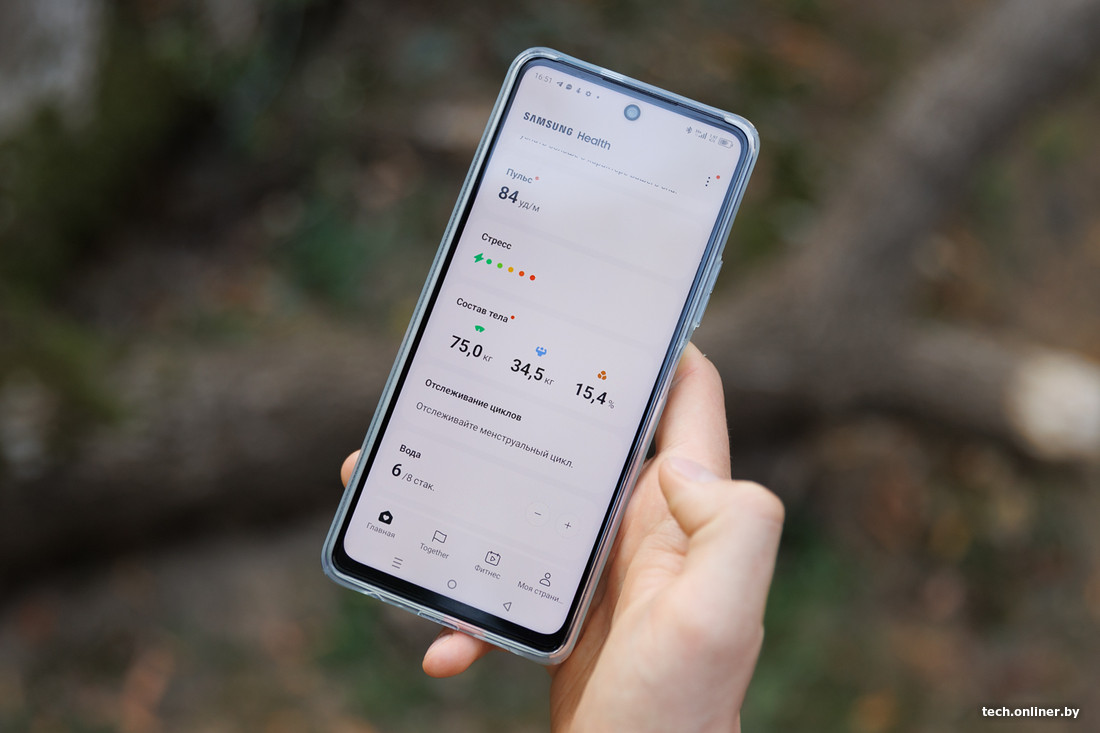 Для тех, кто хочет поиграть в доктора, есть измерение пульса, стресса, кислорода в крови и индекс массы тела. Последнее — забавная опция, которая может подсказать, сколько в вас воды, жировой ткани и скелетной мускулатуры. Естественно, в медицинскую карточку эти данные не вложишь, но выглядит забавно, — говорю как обладатель 46,5 литра воды в организме.