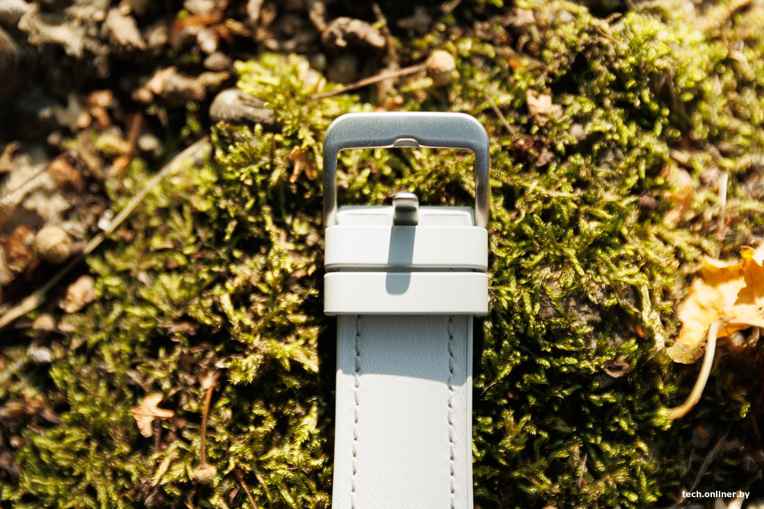 Материал корпуса — глянцевая нержавеющая сталь. Из-за морщинок и стежков на ремешке может показаться, что тот сделан из кожи, но на самом деле это довольно мягкий силикон.