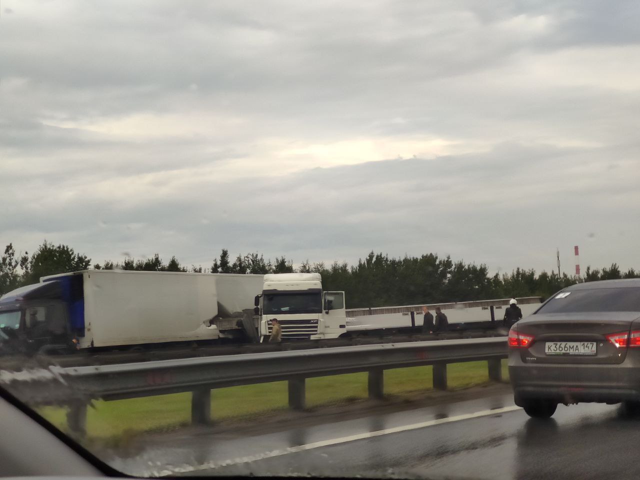 Две фуры и три легковушки попали в аварию на КАД и полностью перекрыли движение по внутреннему кольцу в районе съезда на проспект Культуры — на месте уже собралась серьёзная пробка.