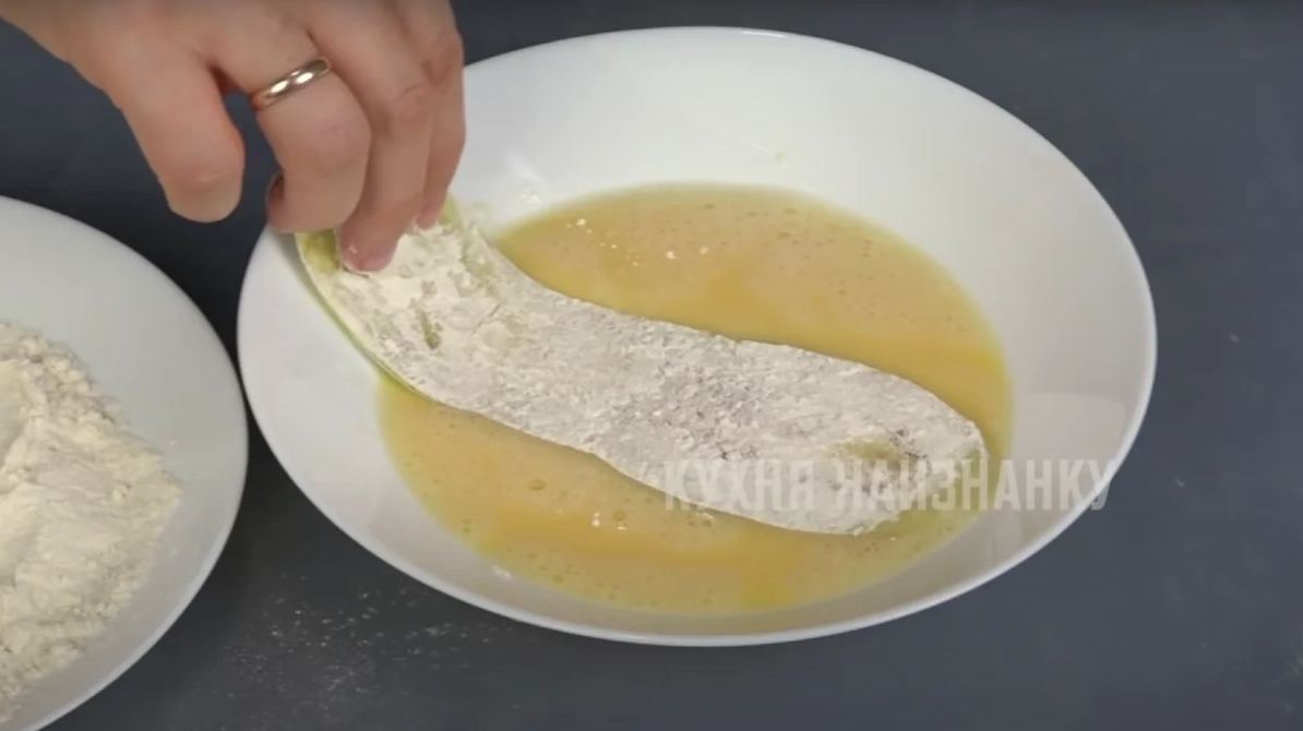Ломтики баклажана просушиваю бумажным полотенцем, опускаю вначале в тарелку с мукой (хорошенько обваливаю со всех сторон), затем во взбитые яйца. Именно так, не наоборот!