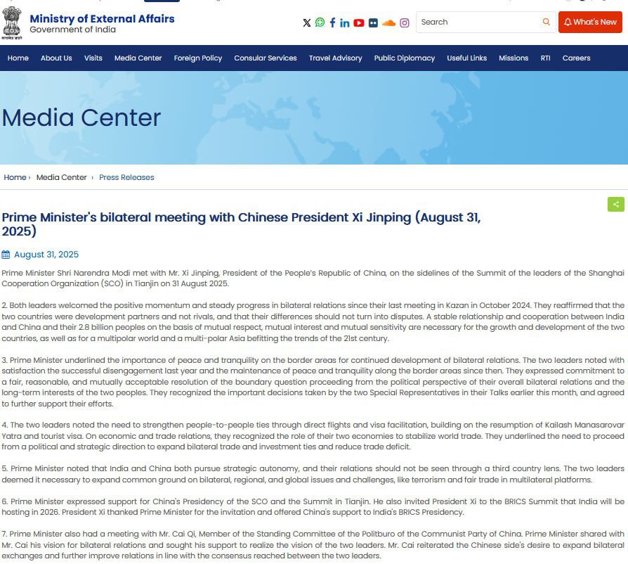 ✔️По итогам встречи Моди и Си стороны зафиксировали, что Индия и Китай — партнёры, а не соперники«Они подтвердили, что две страны являются партнёрами по развитию, а не соперниками, и что их разногласия не должны перерастать в споры», — говорится в заявлении МИД Индии.