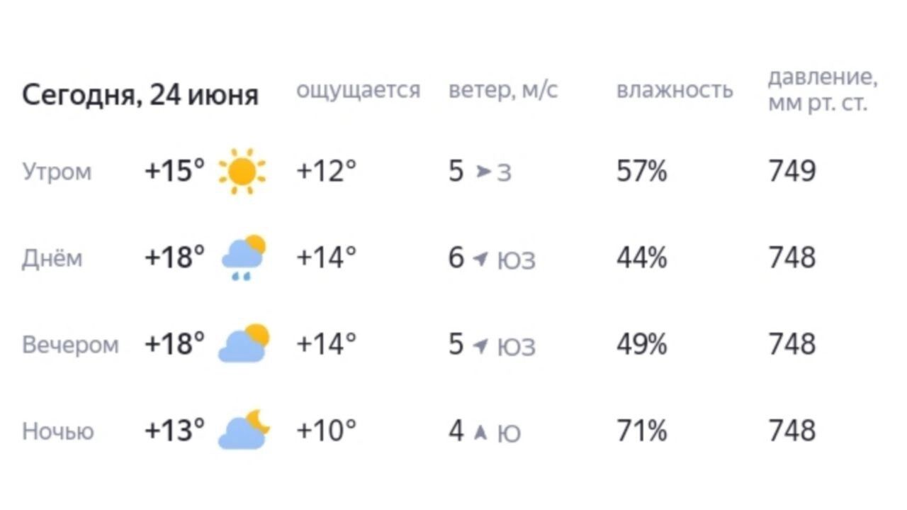 Во вторник, 24 июня, средняя температура днем по ХМАО составит +12…+17 градусов, ночью — +6…+11 градусов. Возможно дневное потепление до +22 градусов (в восточной и южной частях) и ночное похолодание до +1 градуса (в центре, на севере и западе. Также прогнозируют небольшой дождь и переменную облачность. Ветер — северо-западный, 5-10 м/с.