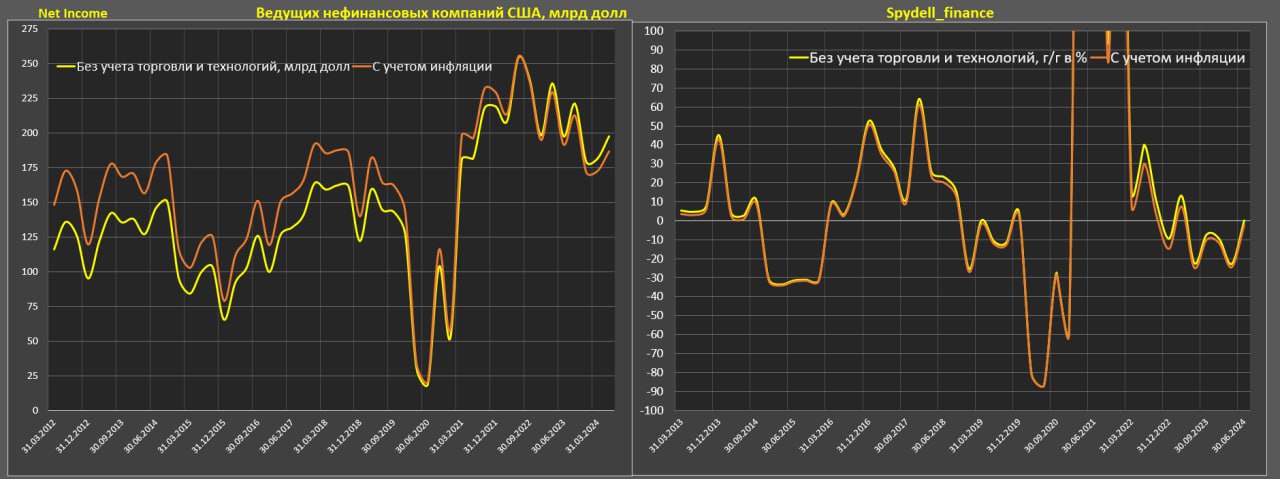 • Без учета технологий и торговли: без изменений и обвал на 22.3% / -12.4% и обвал на 18%, а с учетом инфляции сильнейшее снижение на 26.8% за 2кв24 и -23.3% за 1П24!