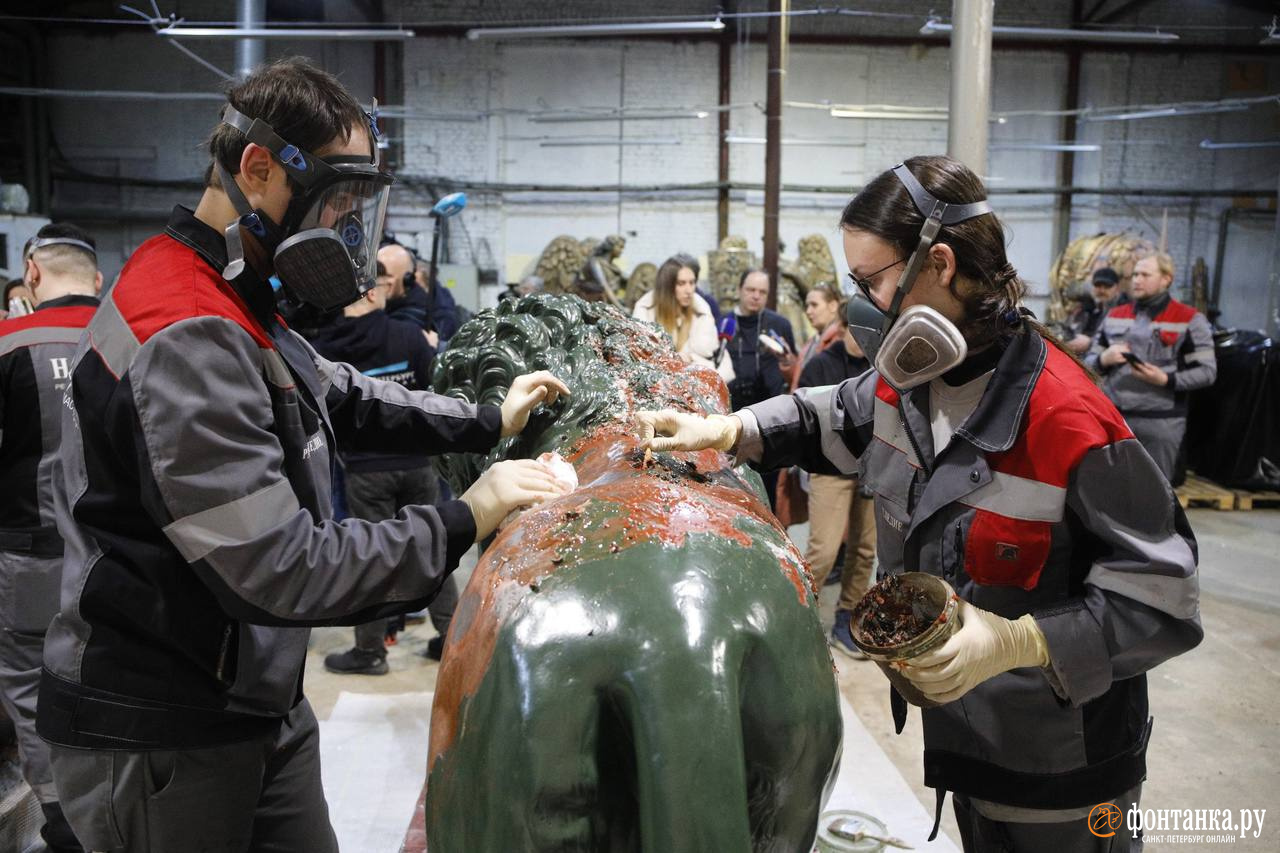 «Туристический сезон 2023 года нанес этим скульптурам такой значительный урон, что необходим был демонтаж скульптур. Сейчас приходится заново реставрировать некоторые фрагменты», — рассказал старший научный сотрудник Музея городской скульптуры и хранитель коллекции памятник Надежда Ефремова.
