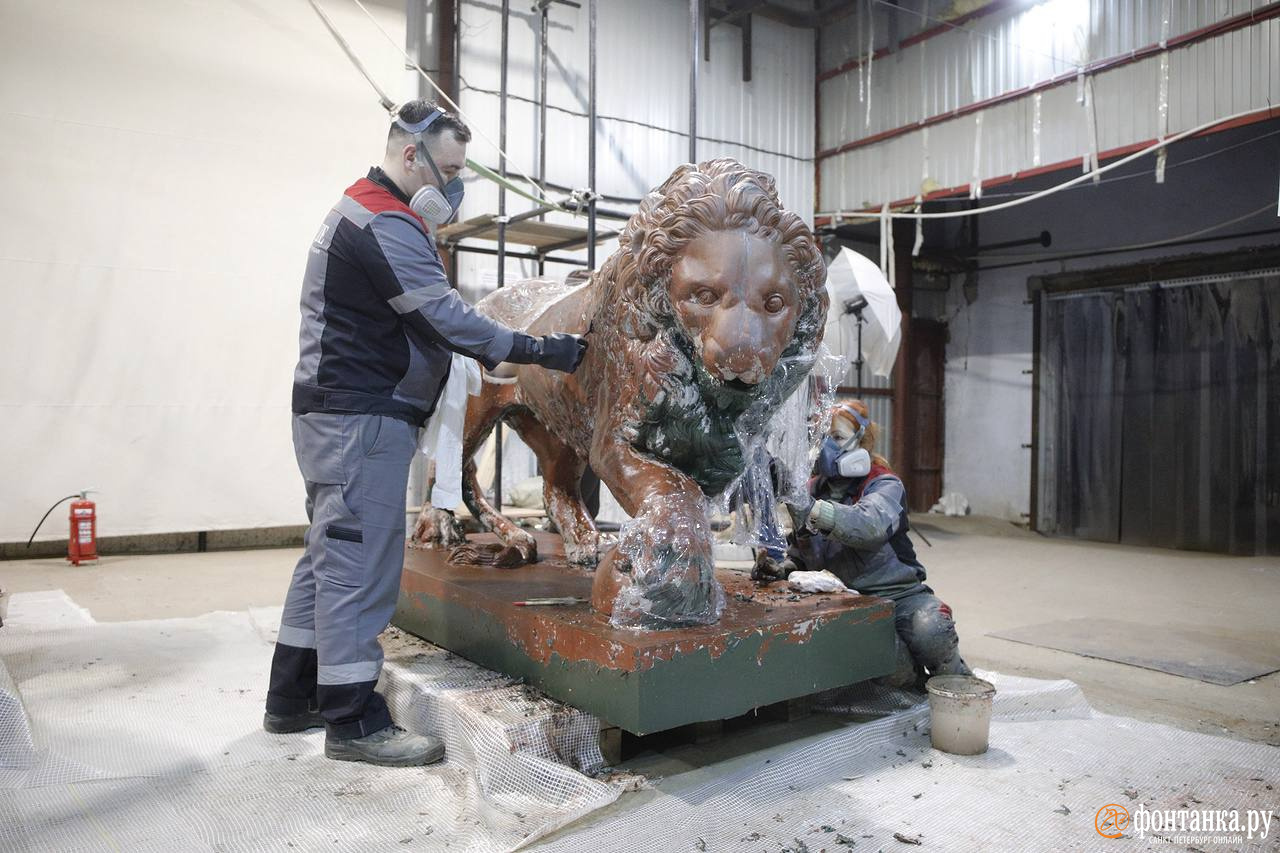 Специалисты государственного музея городской скульптуры работают над восстановлением львов с Адмиралтейской набережной. В понедельник, 29 января, «Фонтанка» посмотрела рабочий процесс в реставрационной мастерской.