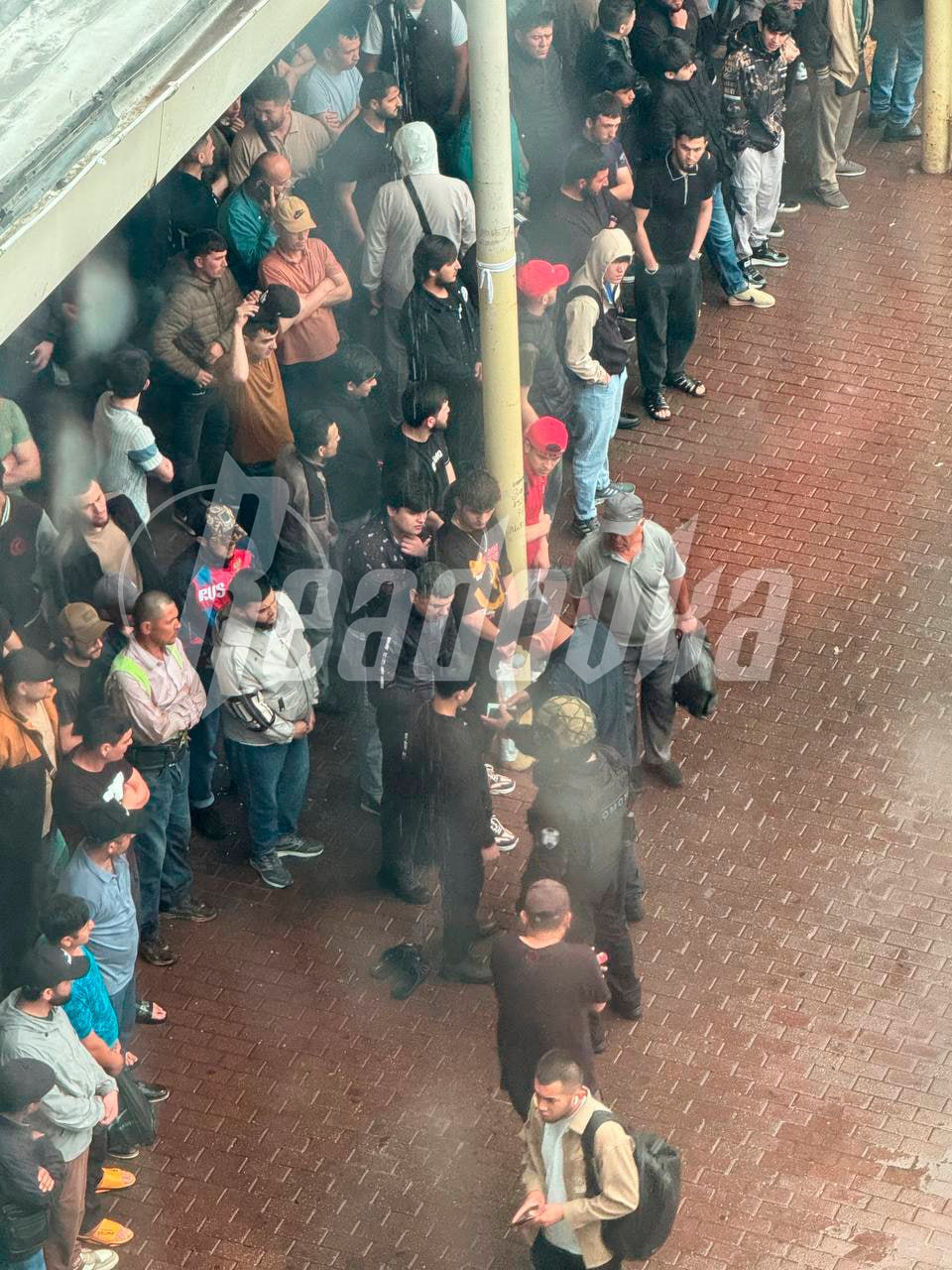 У здания стоят автозаки, работников рынка вывели под навес на улице — у них проверяют документы.