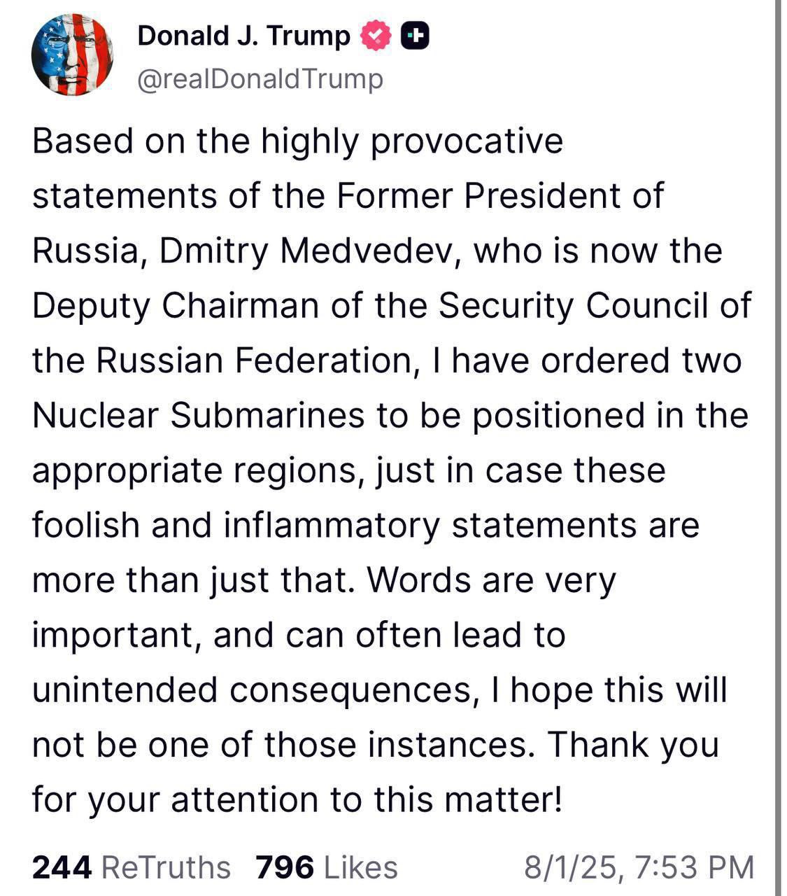 Трамп приказал разместить две атомные подлодки рядом с Россией. Российский рынок пошел вниз на фоне заявления.