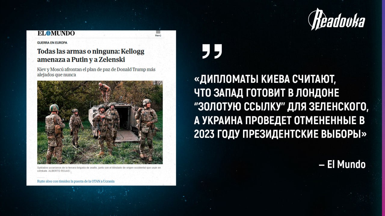 В дипломатических кругах Киева уже 2 недели обсуждают, что Зеленского может ждать «золотая ссылка» в Лондоне после прекращения огня, сообщает El Mundo. Предполагается, что после этого на Украине возобновят президентские выборы, отмененные в 2023 году. При этом некоторые украинские дипломаты ожидают «быстрого» вступления незалежной в ЕС, субсидий на восстановление и размещения натовских «миротворцев». Украинское издание «Страна» также сообщает, что ОП Украины готовится к переговорам с Россией и новым выборам президента.