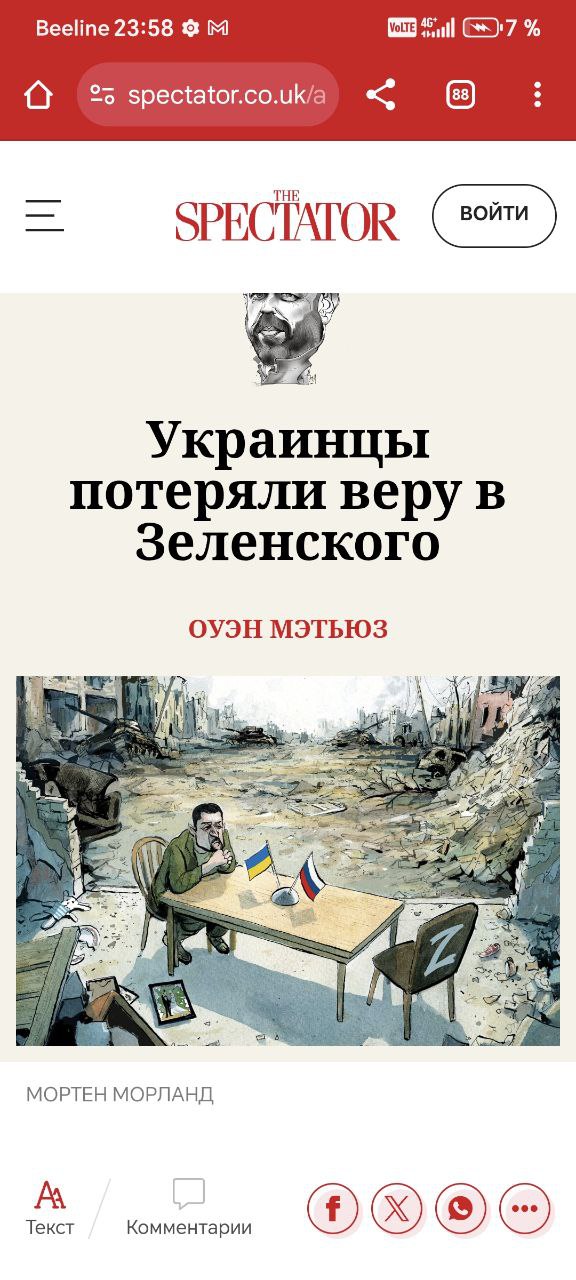В британском еженедельном журнале The Spectator вышла печальная для украинской власти и Зеленского статья. Кроме прямых цитат бывших и нынешних чиновников о об утрате Зеленским доверия несмотря на круглосуточную пропаганду, издание приводит и социологические данные: