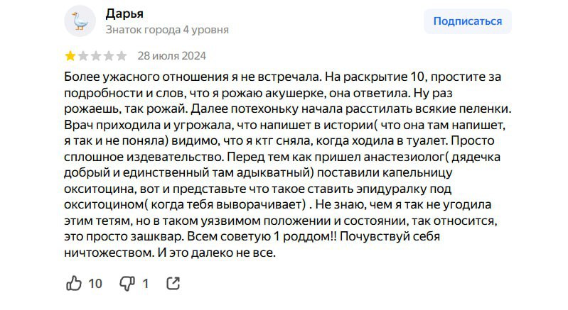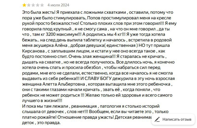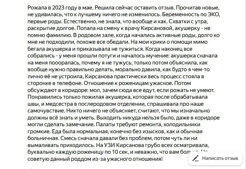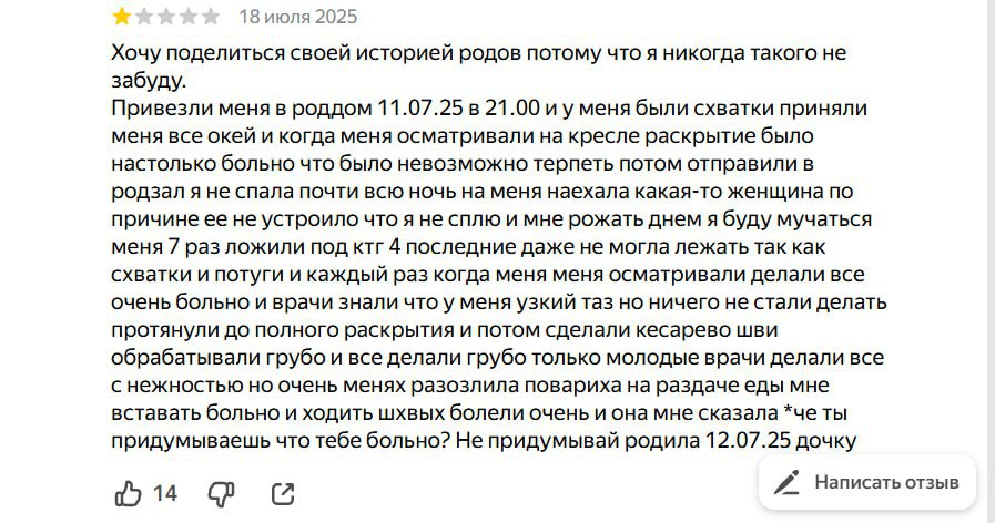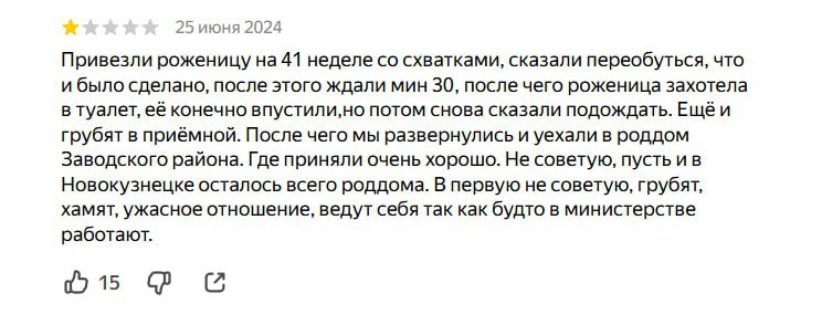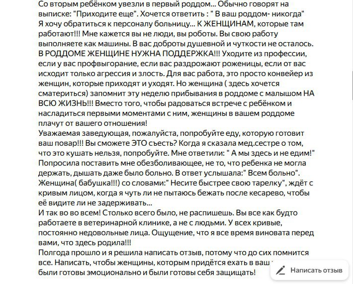 Кроме того, в отзывах к больнице полно негативных комментариев о халатности персонала, нарушении санитарных норм и акушерском насилии.