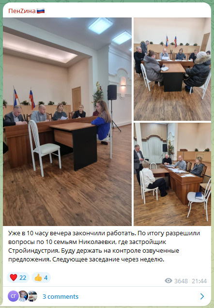 Елена Пензина пишет, что на встрече «разрешили вопросы по 10 семьям Николаевки». Мы пообщались с николаевцами и выяснили, что называть вопросы «разрешенными» пока рановато.