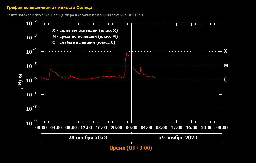 Буря связана со вспышкой на Солнце, которая стала двенадцатой в списке самых сильных с начала 2023 года. Она достигла практически потолка среднего уровня с активностью М9,8, подойдя вплотную к сильному уровню.