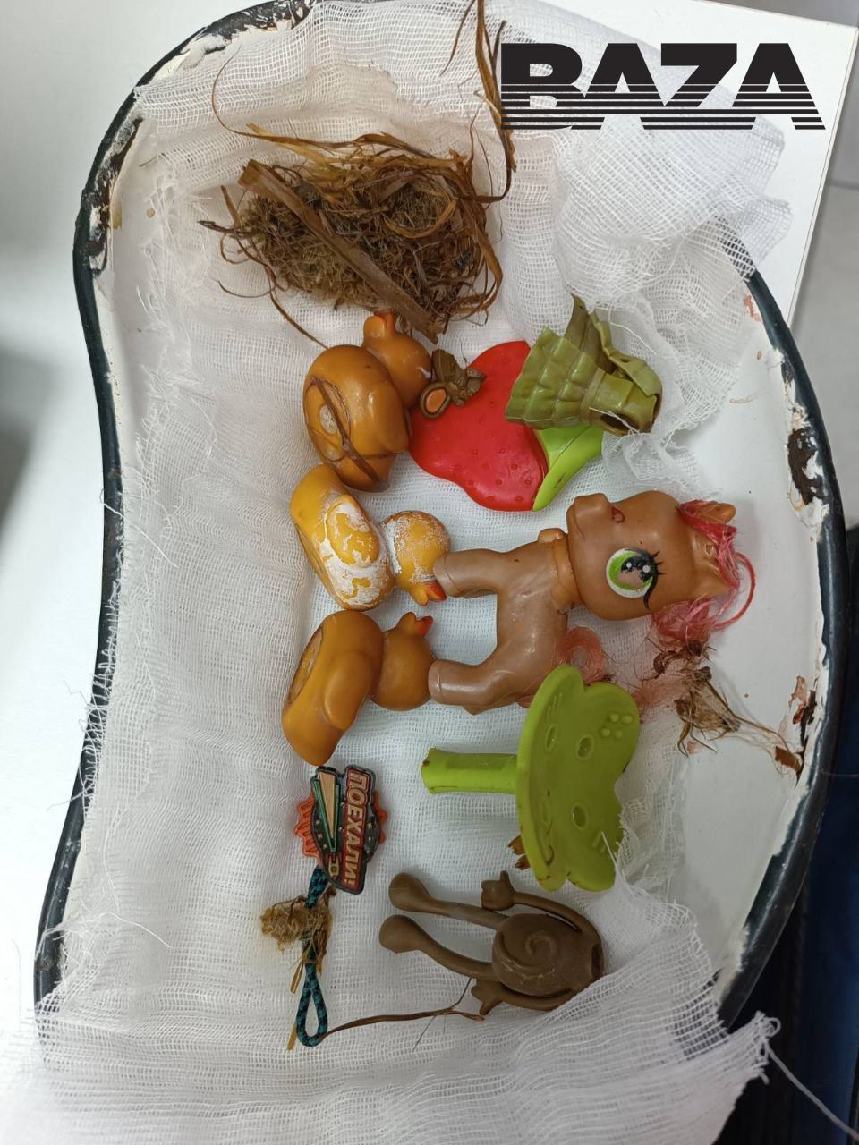 Животное прооперировали, вытащили все инородные тела — от пластиковой пони до скрепышей, — и теперь собаке гораздо легче.