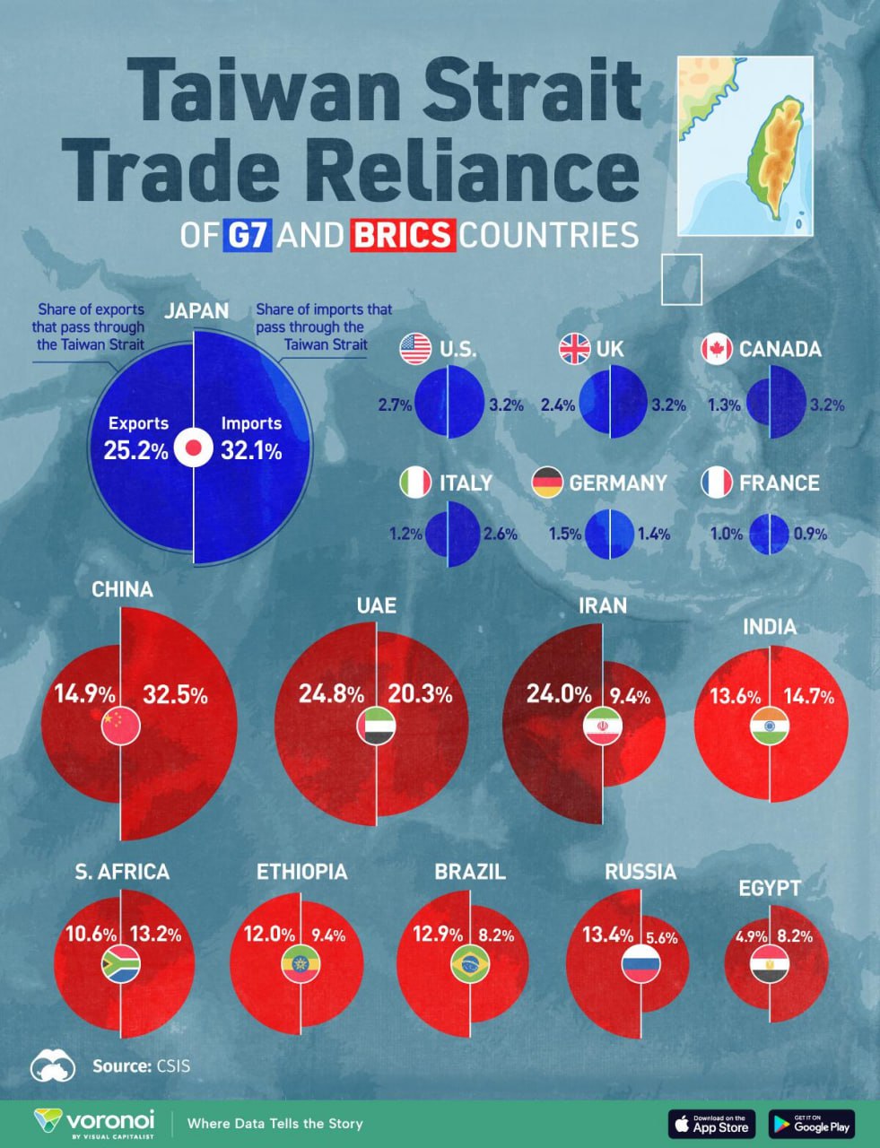 Если не брать в расчёт Японию, то страны G7 гораздо меньше зависят от Тайваньского пролива. Для США, Британии, Канады, Италии, Германии и Франции доля импорта и экспорта через пролив имеет минимальное значение. Стоит отметить, что нефтяные поставки для Японии тоже могут пройти восточнее — при этом удлинится логистическое плечо, но сами поставки будут возможны.