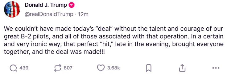 ΠΡΡΠΌΠΎ Π² ΠΌΠΎΠΌΠ΅Π½Ρ, ΠΊΠΎΠ³Π΄Π° ΠΡΠ°Π½ ΠΈ ΠΠ·ΡΠ°ΠΈΠ»Ρ ΠΏΡΠΎΠ΄ΠΎΠ»ΠΆΠ°ΡΡ ΠΎΠ±ΠΌΠ΅Π½ΠΈΠ²Π°ΡΡΡΡ ΡΠ΄Π°ΡΠ°ΠΌΠΈ, ΠΏΡΠ΅Π·ΠΈΠ΄Π΅Π½Ρ Π‘Π¨Π ΠΠΎΠ½Π°Π»ΡΠ΄ Π’ΡΠ°ΠΌΠΏ ΠΎΠΏΡΠ±Π»ΠΈΠΊΠΎΠ²Π°Π» ΠΎΡΠ΅ΡΠ΅Π΄Π½ΠΎΠΉ ΠΏΠΎΡΡ, Π² ΠΊΠΎΡΠΎΡΠΎΠΌ Π½Π°Π·Π²Π°Π» Π½Π΅Π΄Π°Π²Π½ΡΡ Π±ΠΎΠΌΠ±Π°ΡΠ΄ΠΈΡΠΎΠ²ΠΊΡ ΠΡΠ°Π½Π° βΠΈΠ΄Π΅Π°Π»ΡΠ½ΡΠΌ ΠΏΠΎΠΏΠ°Π΄Π°Π½ΠΈΠ΅ΠΌβ ΠΈ ΠΏΠΎΠ±Π»Π°Π³ΠΎΠ΄Π°ΡΠΈΠ» ΠΏΠΈΠ»ΠΎΡΠΎΠ² B-2 Π·Π° ΡΡΠ°ΡΡΠΈΠ΅ Π² βΡΠ΄Π΅Π»ΠΊΠ΅β.