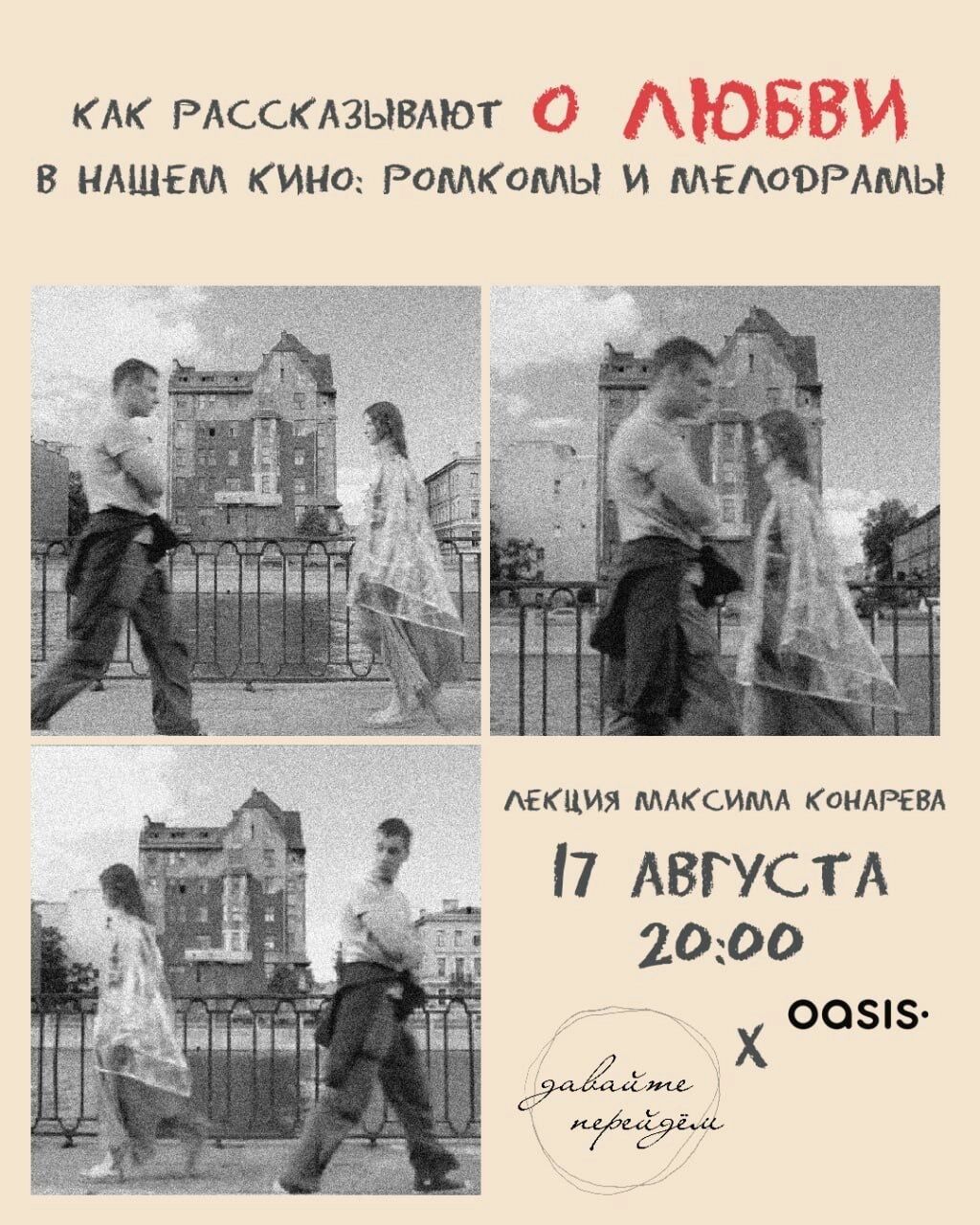Лекция «Как рассказывают о любви в нашем кино: ромкомы и мелодрамы» (18+) пройдет в баре Oasis social club. На ней обещают обсудить жанровое российское кино о любви и смотреть отрывки из фильмов. Речь пойдет о пяти кинокартинах: «Питер FM», «Прогулка», «Аритмия», «Неадекватные люди 1 и 2».