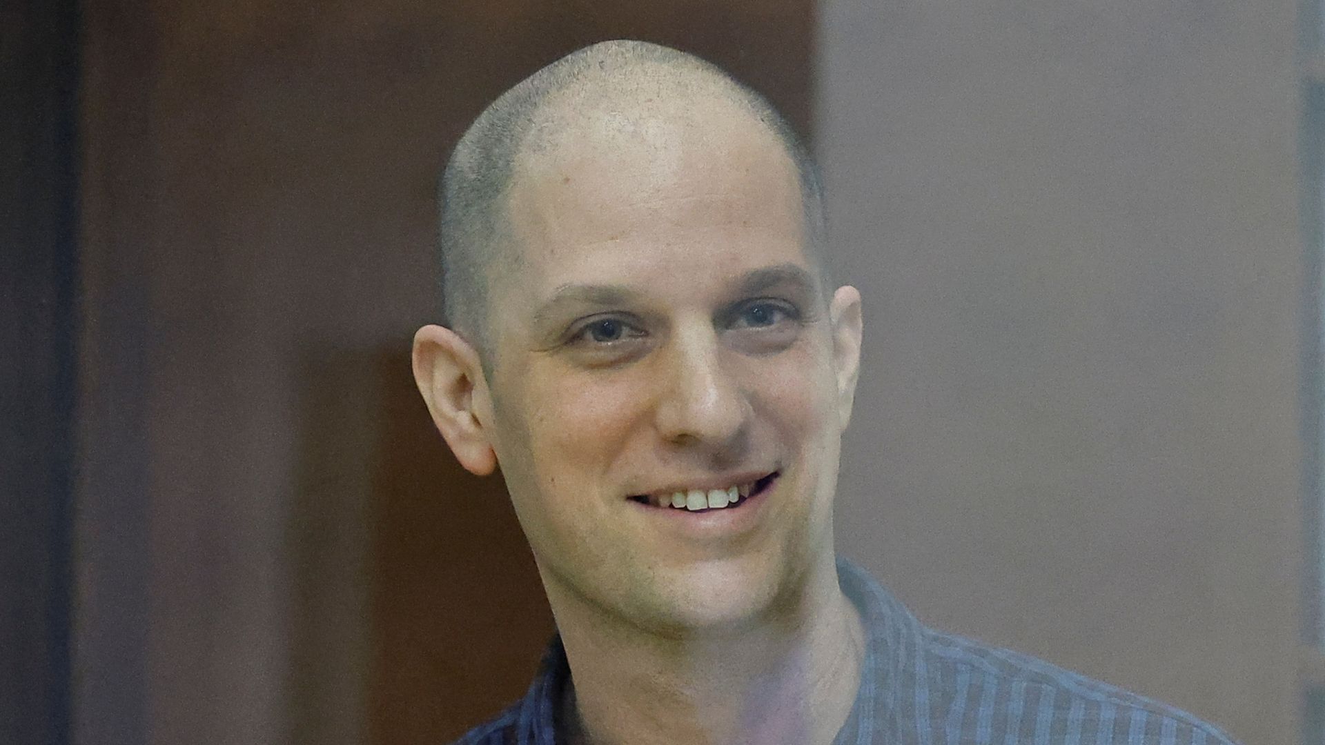 Gershkovich was seen standing in a glass box, with a shaved head.