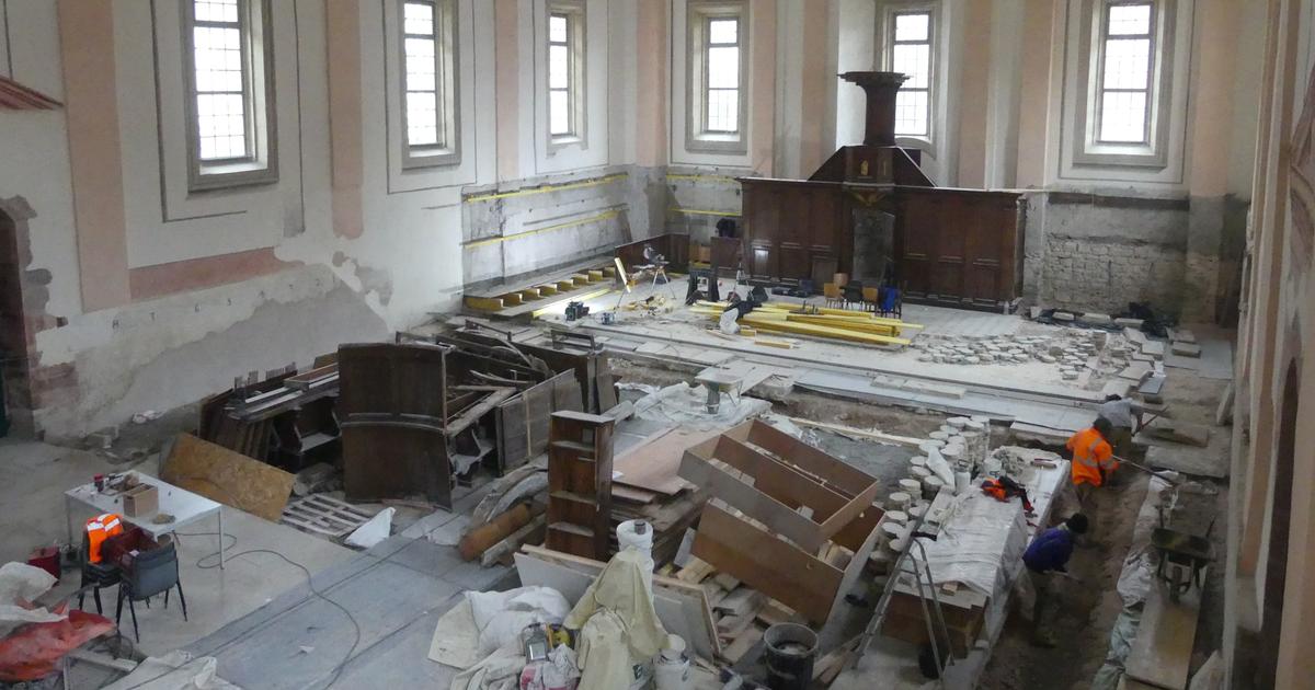« Il y a deux ans de cela, nous avions réalisé des diagnostics dans le cimetière adjacent (fermé et transféré en 1542, NDLR), raconte Adrien Vuillemin. J’avais alors observé un mur particulier sur le dallage de l’édifice. » À l’époque, donc, en 2022, le diagnostic opéré sur la place Saint-Martin de Montbéliard, à une dizaine de mètres au sud du temple, a révélé plusieurs sépultures, dont une datée entre 1302 et 1411. « Nous sommes revenus une semaine en novembre 2024, puis deux semaines en janvier dernier, pour suivre des travaux d’installation de chauffage », poursuit le spécialiste du Moyen Âge, de l’Époque moderne et de l’Époque contemporaine. Des tranchées ont alors été creusées par les chercheurs de l’Inrap dans le dallage du temple afin d’y effectuer un sondage archéologique.