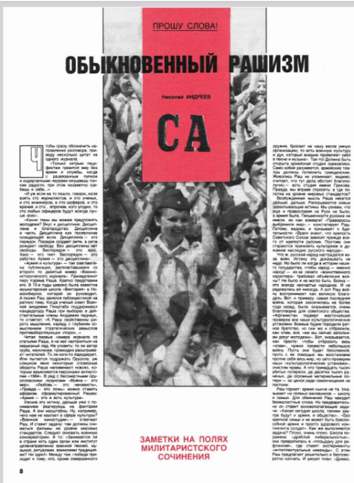 Слово «Рашизм» в журнале Огонек в 1990! Анекдот в том, что тут обыгрывается не Russia, а фамилия писателя — Карем Раш. Но он по взглядам был как Прилепин сейчас, один в один.