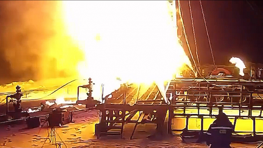 Судя по оказавшимся в распоряжении телеканала кадрам, в результате взрыва произошел пожар. Огонь охватил двух человек, они побежали прочь и легли на землю. В дальнейшем коллега стал тушить их.