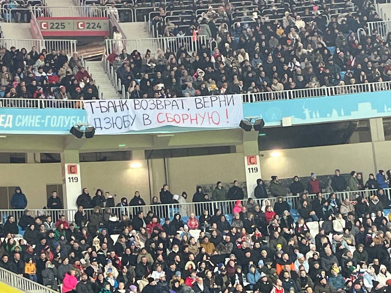 Футбольные фанаты попросили Т-Банк вернуть Артёма Дзюбу в сборную и вывесили баннер во время сегодняшнего матча между Россией и Сирией в Волгограде.